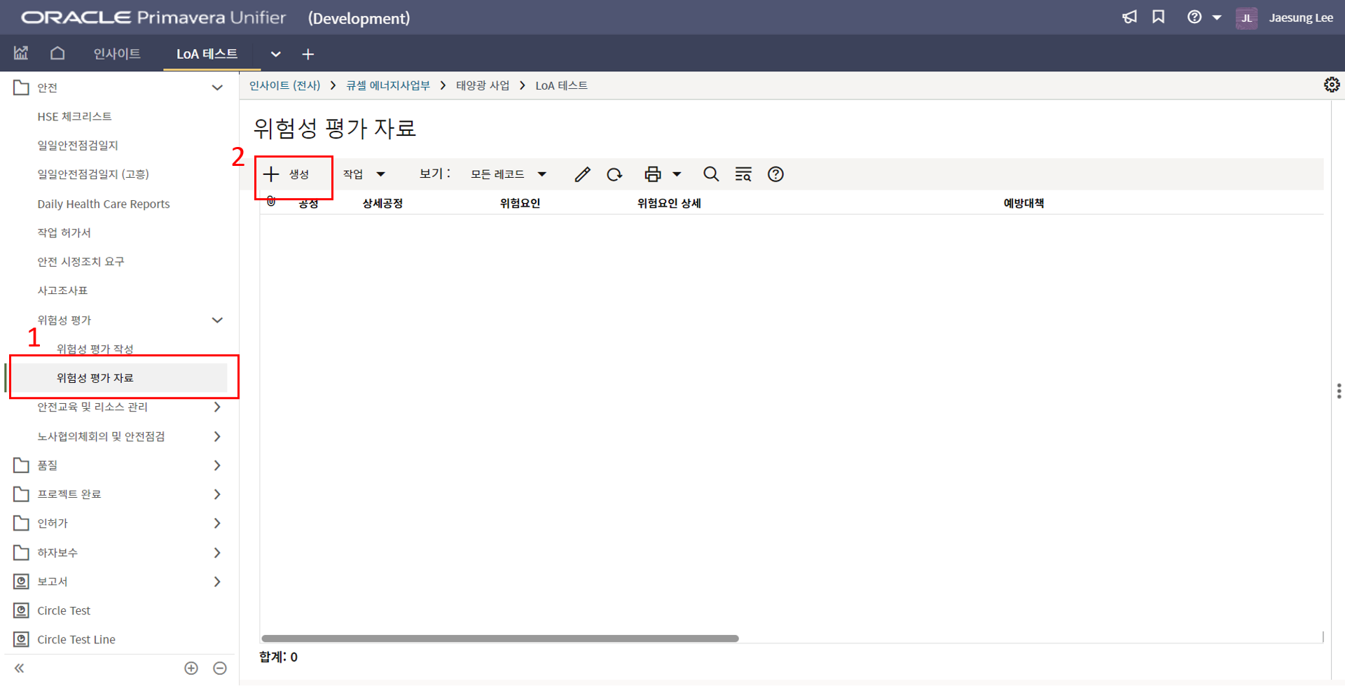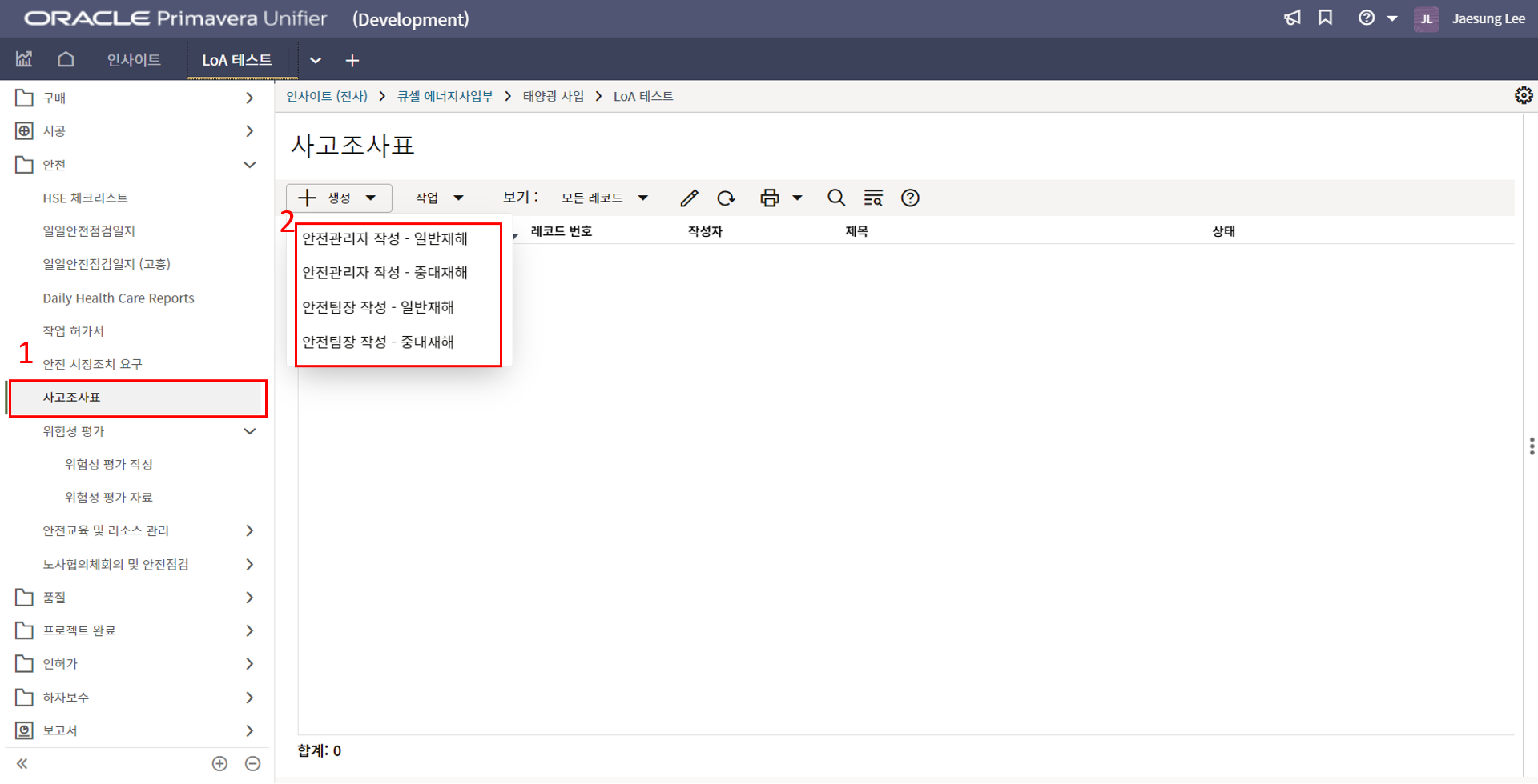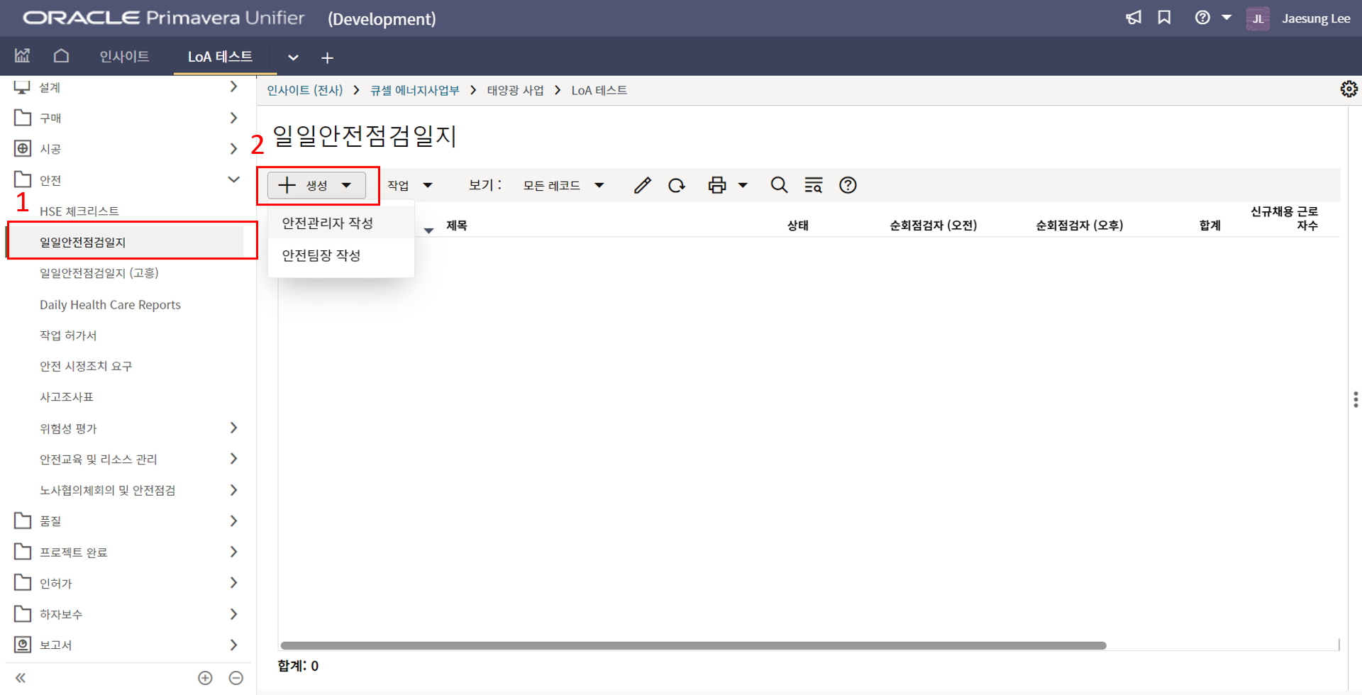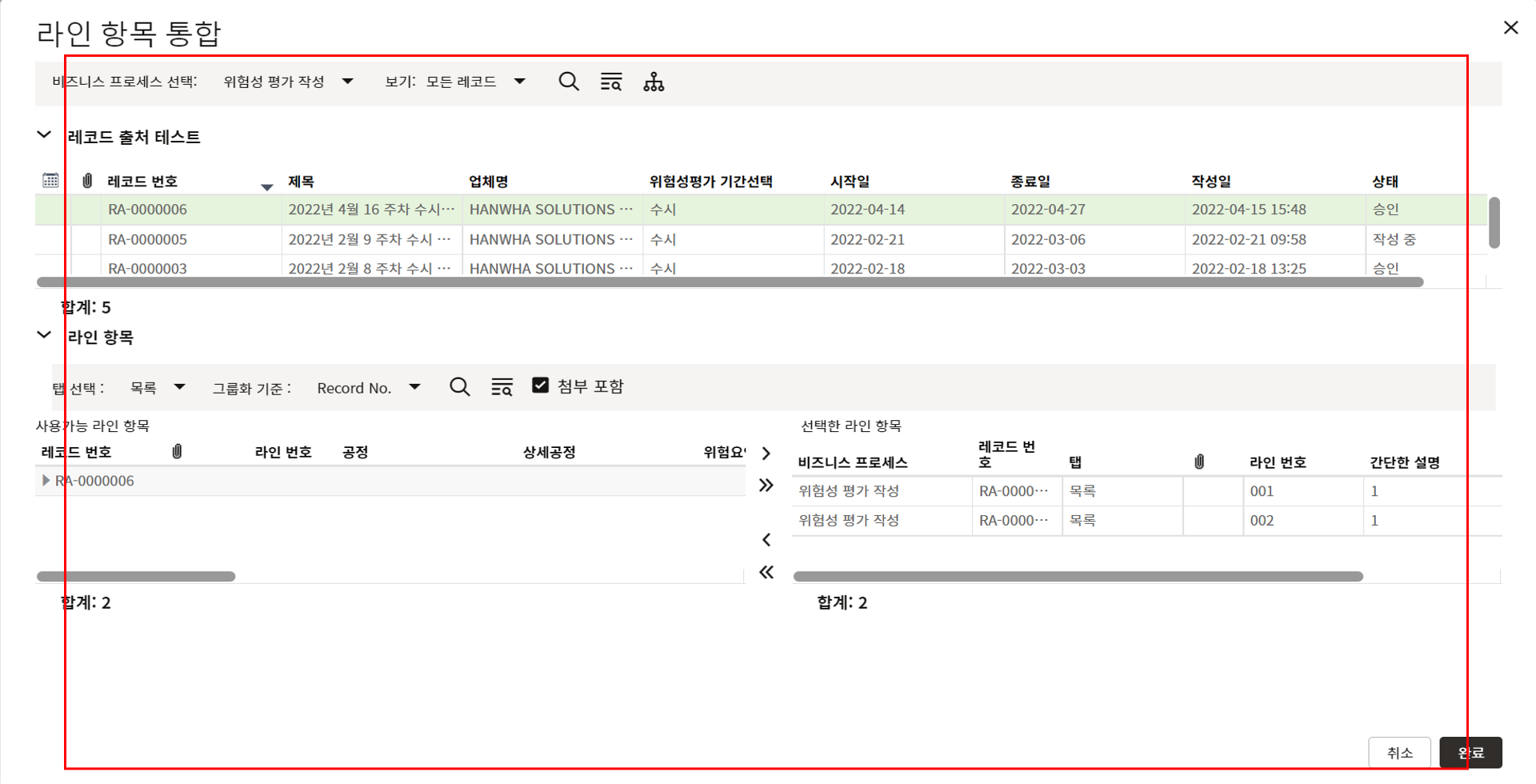 3. 상위 양식을 채운 후 한화솔루션 안전 팀장 검토를 위해 전송합니다.