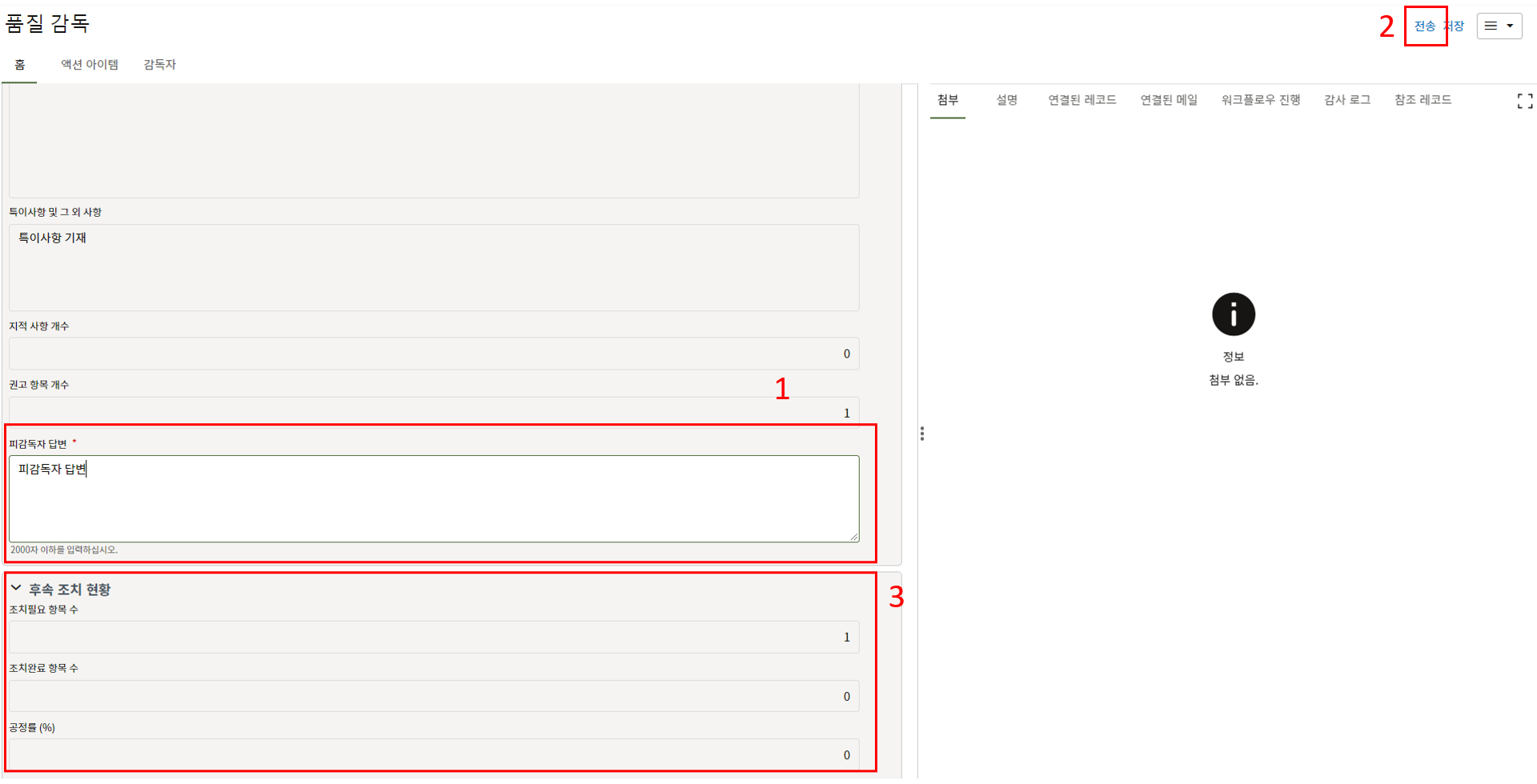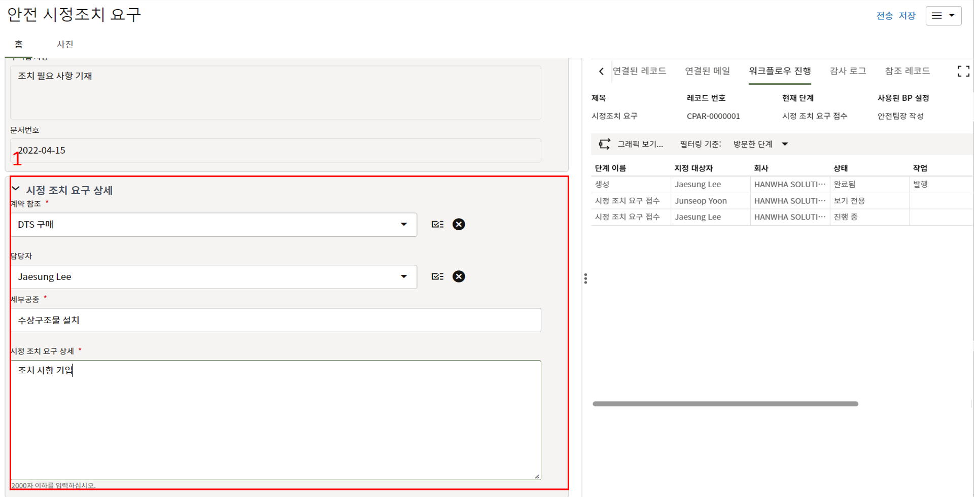 4.담당자는 액션을 취한 후 "진행 세부사항"을 입력하여 전송하면 검토자에게 전달되고,