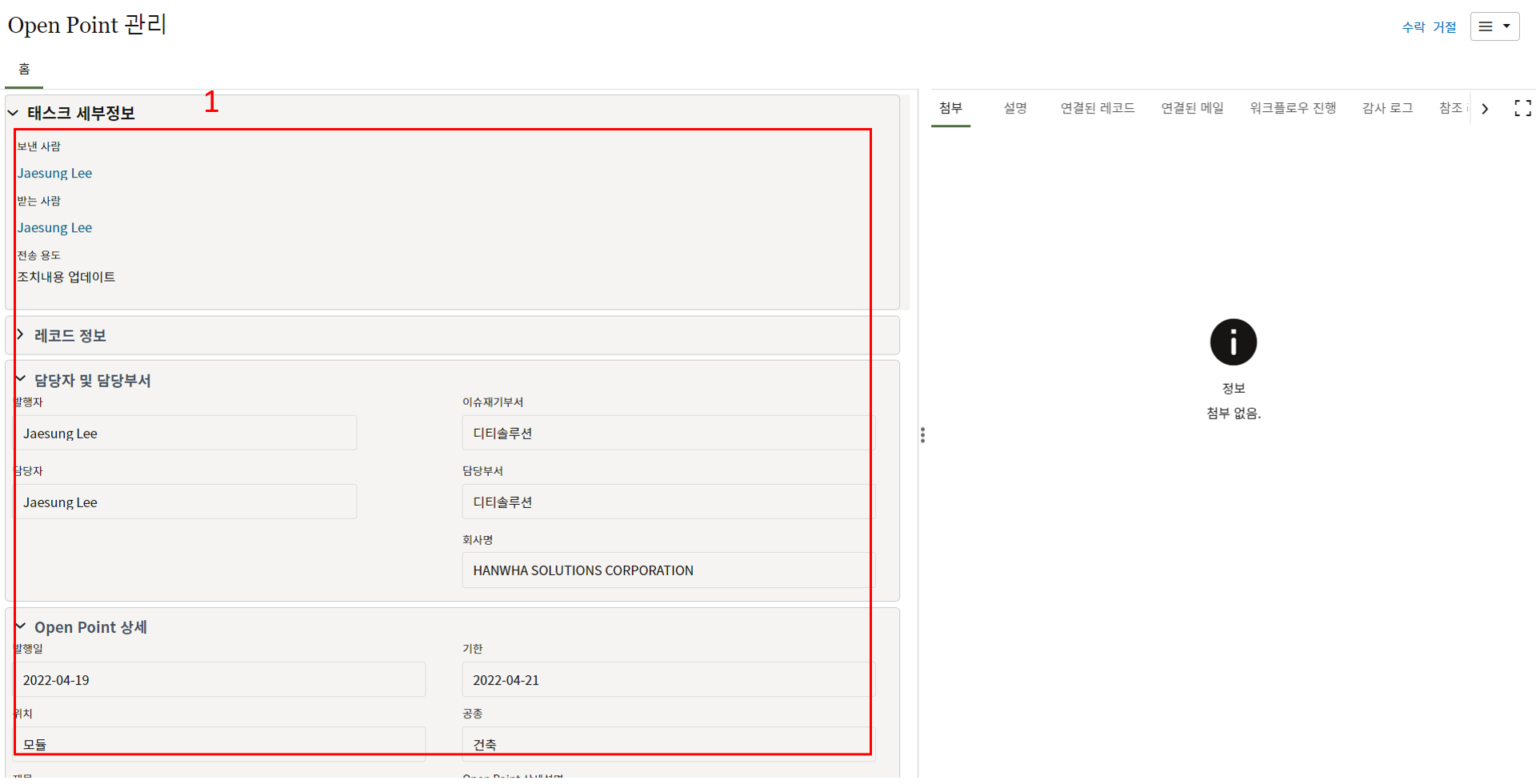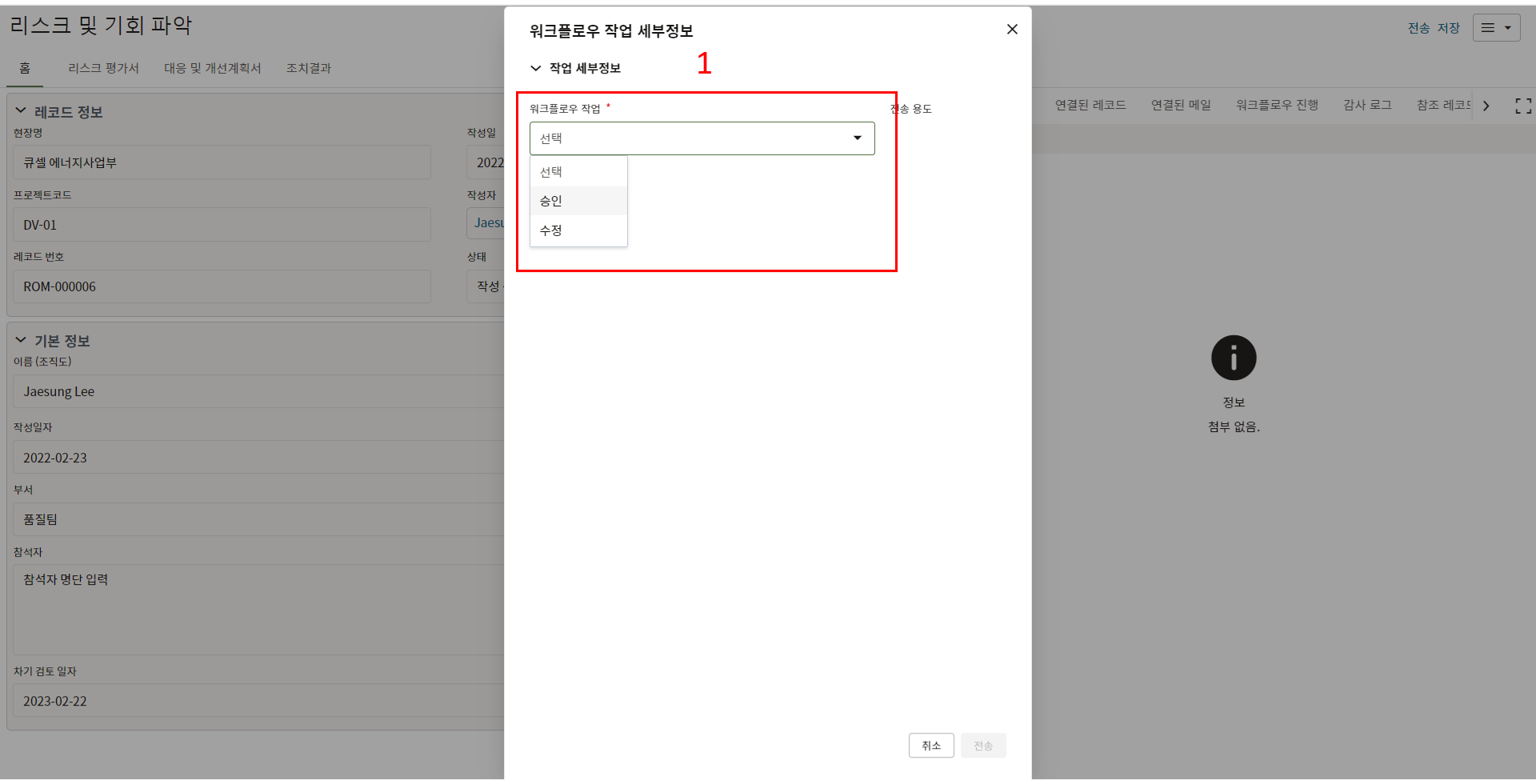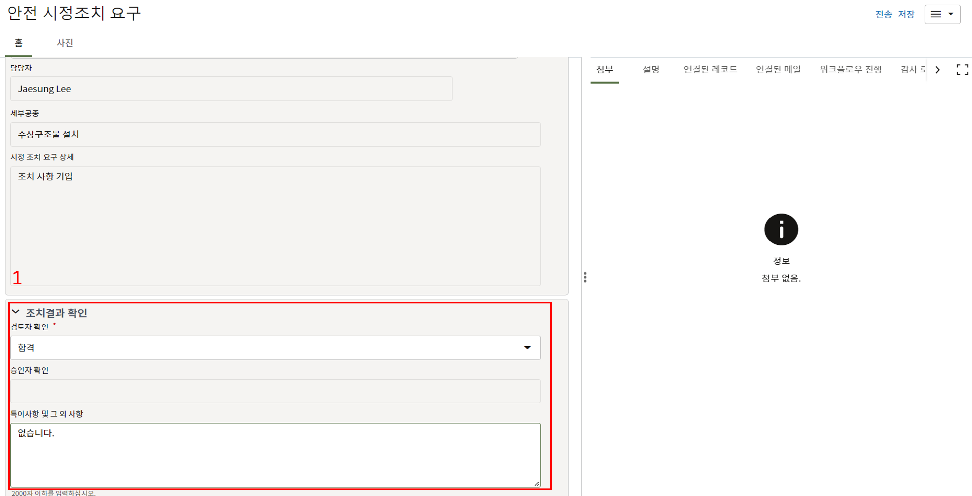3.내용 확인만 필요한 태스크의 경우 레코드 정보를 검토 후 승인 또는 수정요청으로 전송합니다.