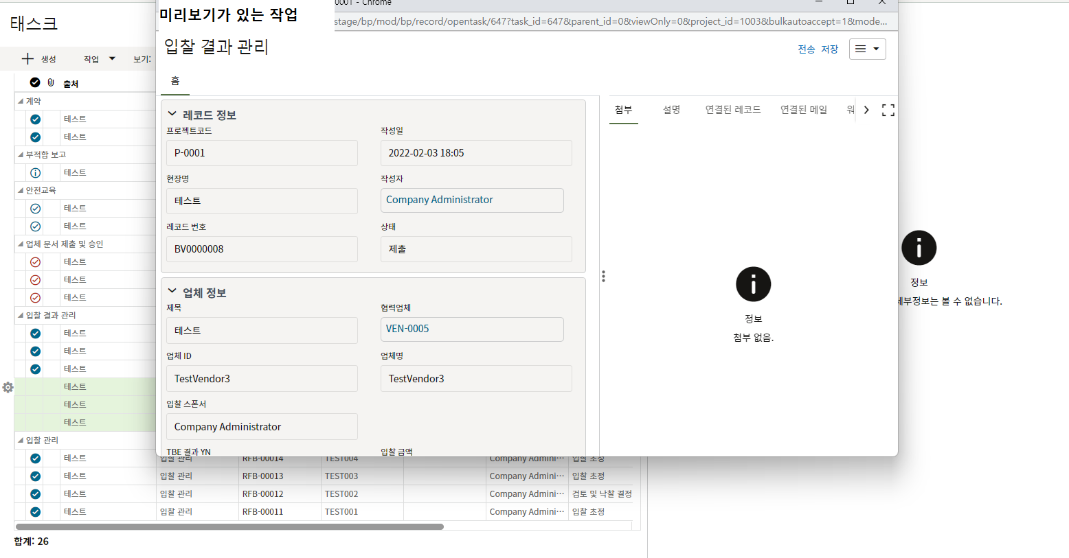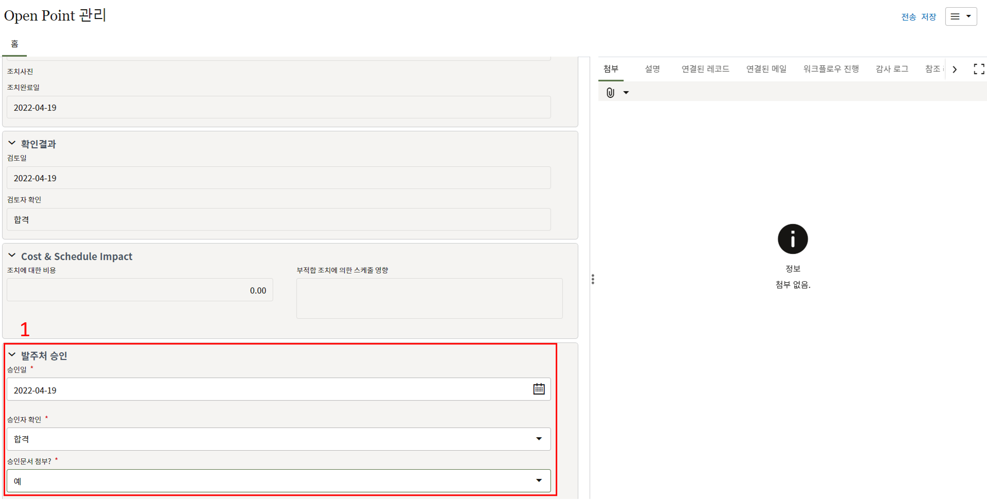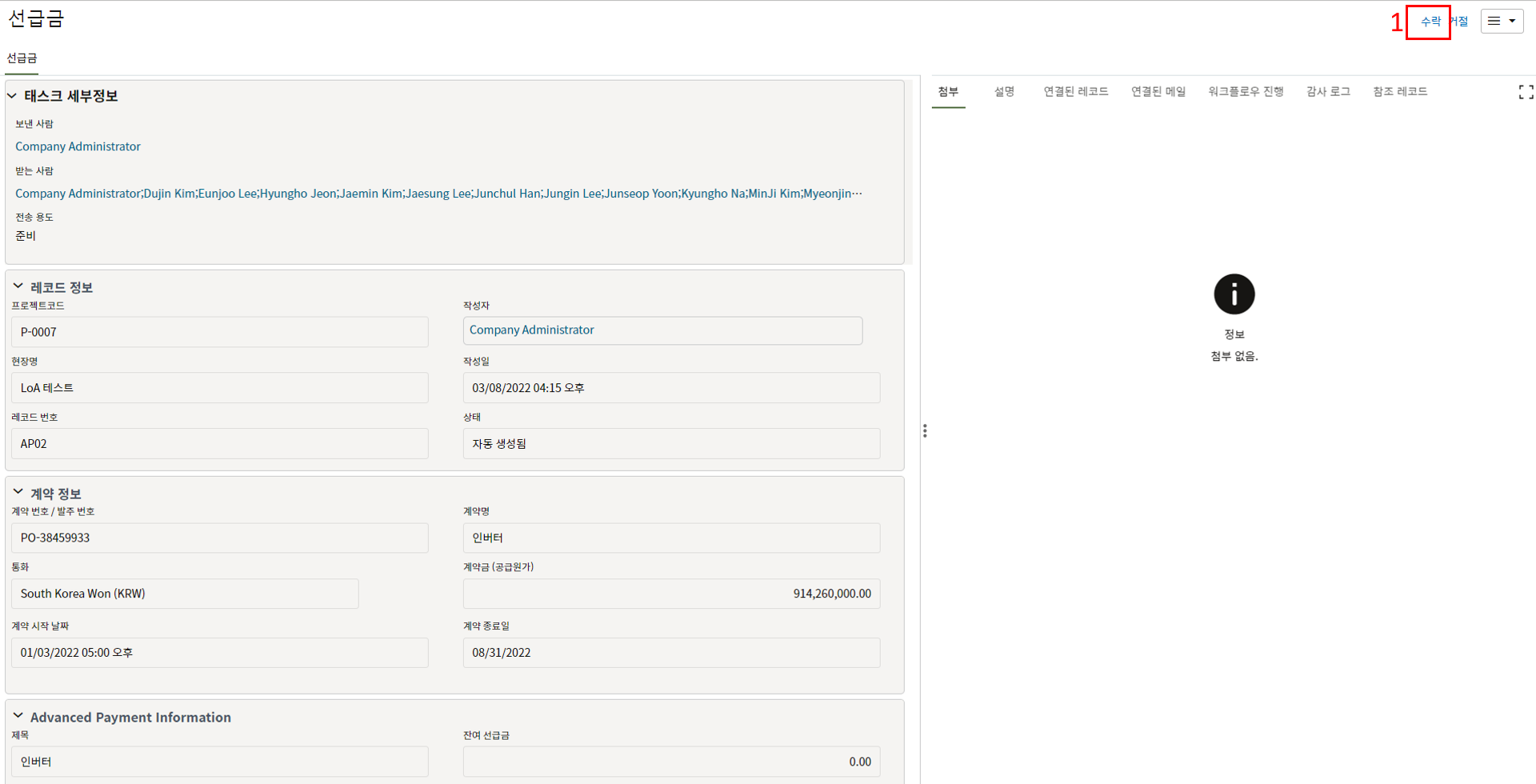 3.내용 확인만 필요한 태스크의 경우 레코드 정보를 검토 후 승인 또는 수정요청으로 전송합니다.