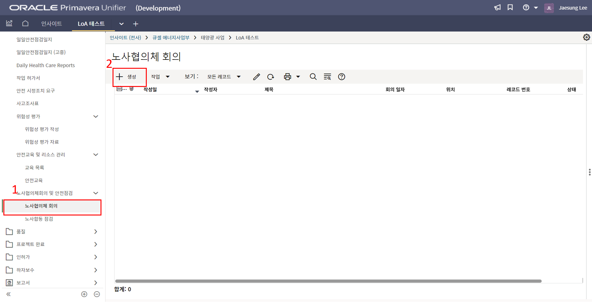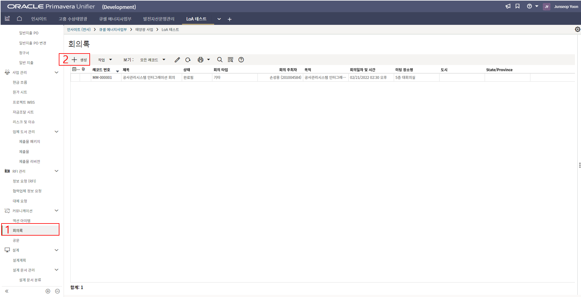 2.'1)회의록 > 2) 생성'를 클릭합니다.