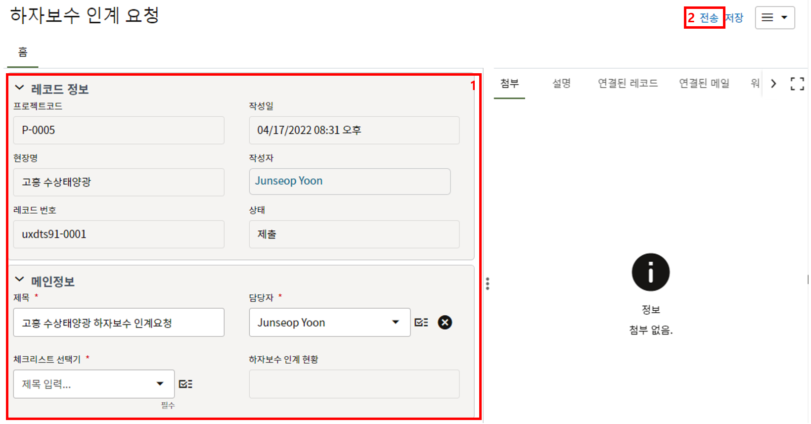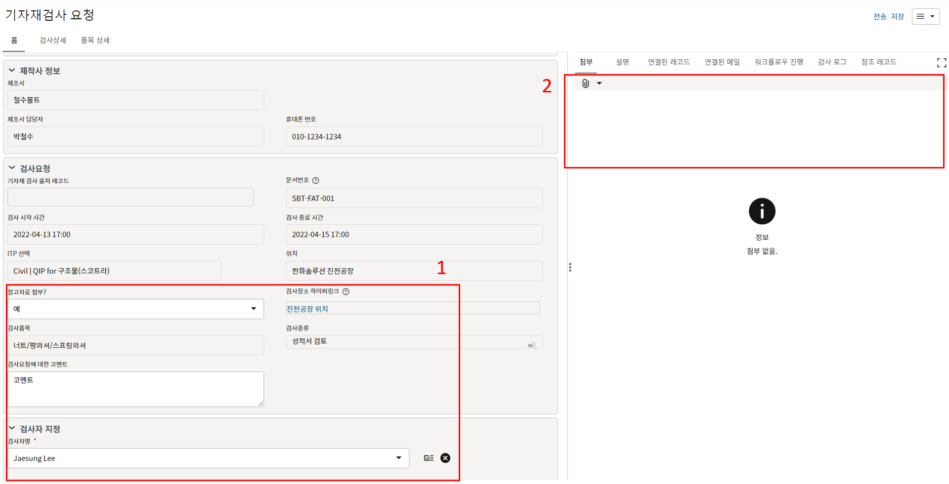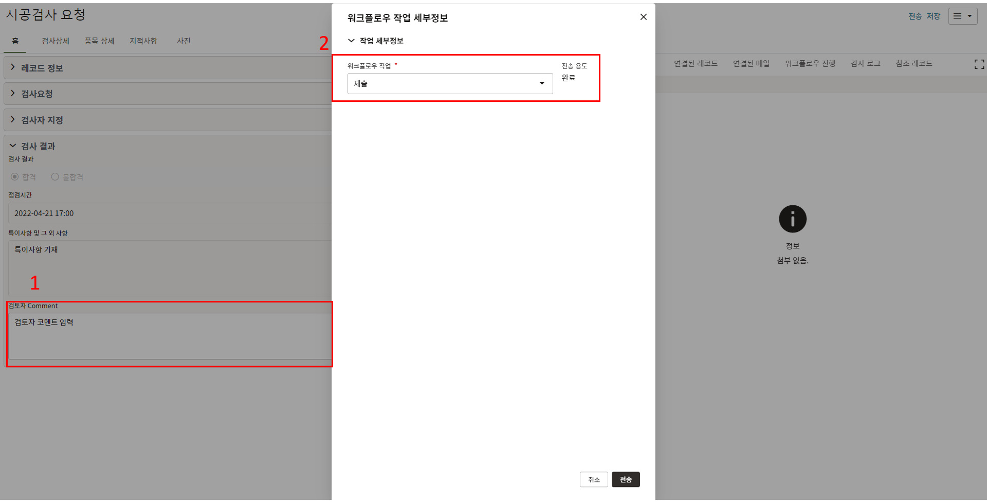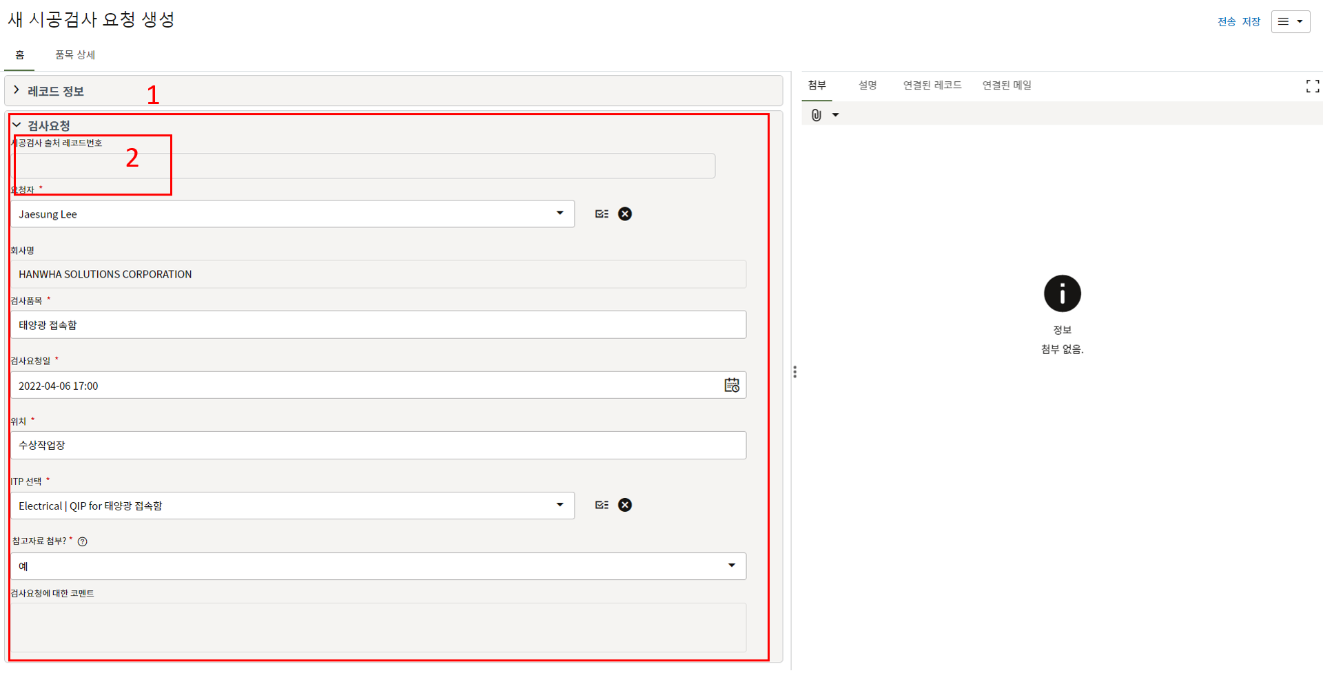 3. 검사 요청 내용을 작성합니다. 이전 검사 요청이 불합격된 경우 요청 내용이 자동생성되며 시공검사 출처 레코드 번호 항목에