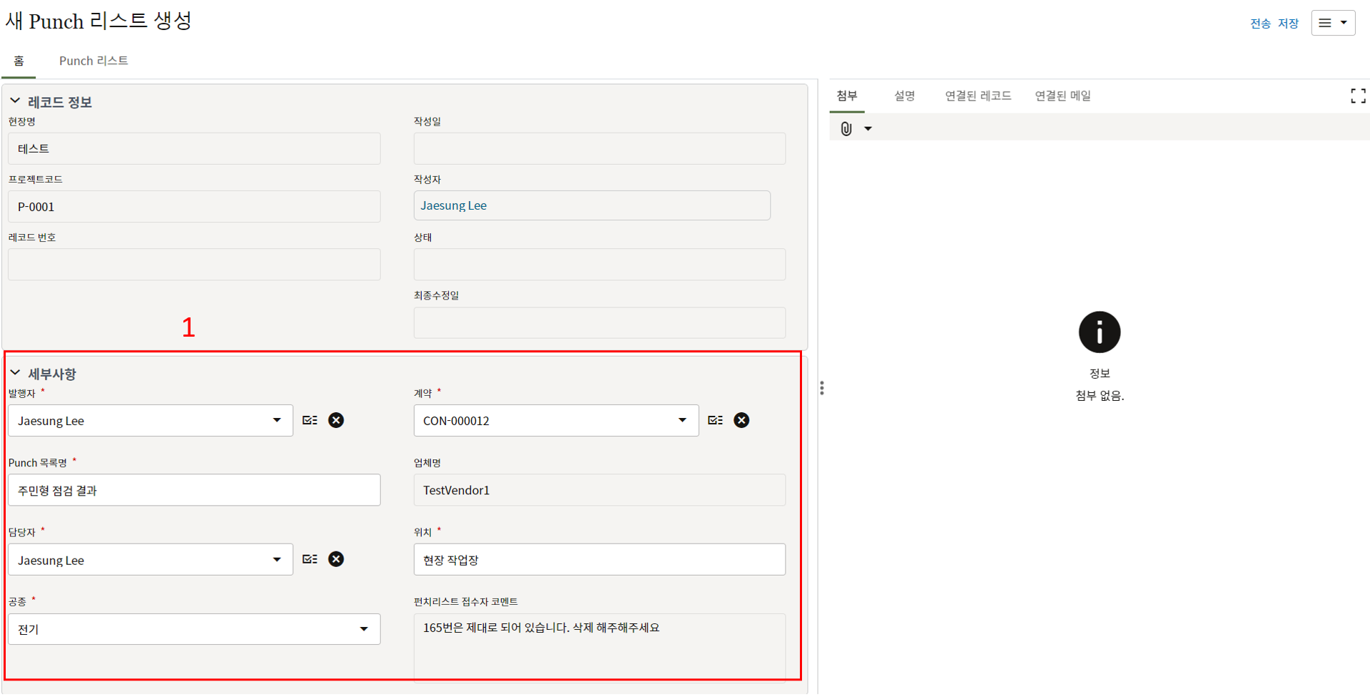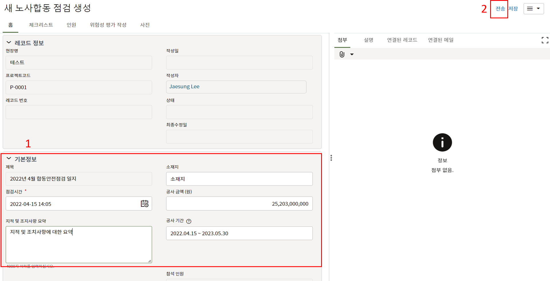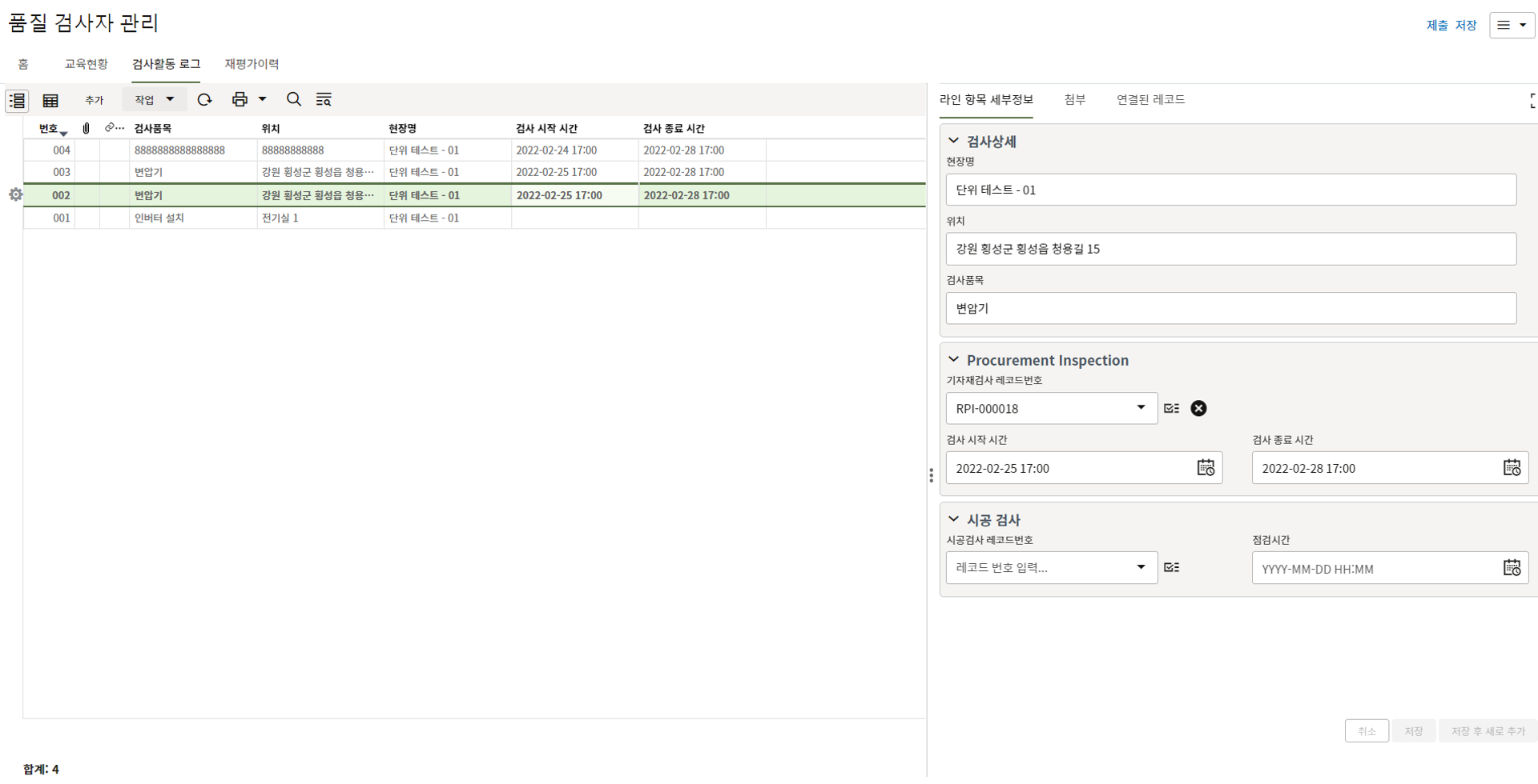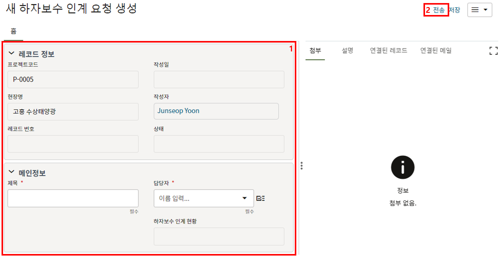 3. 검사 요청 내용을 작성합니다. 이전 검사 요청이 불합격된 경우 요청 내용이 자동생성되며 시공검사 출처 레코드 번호 항목에