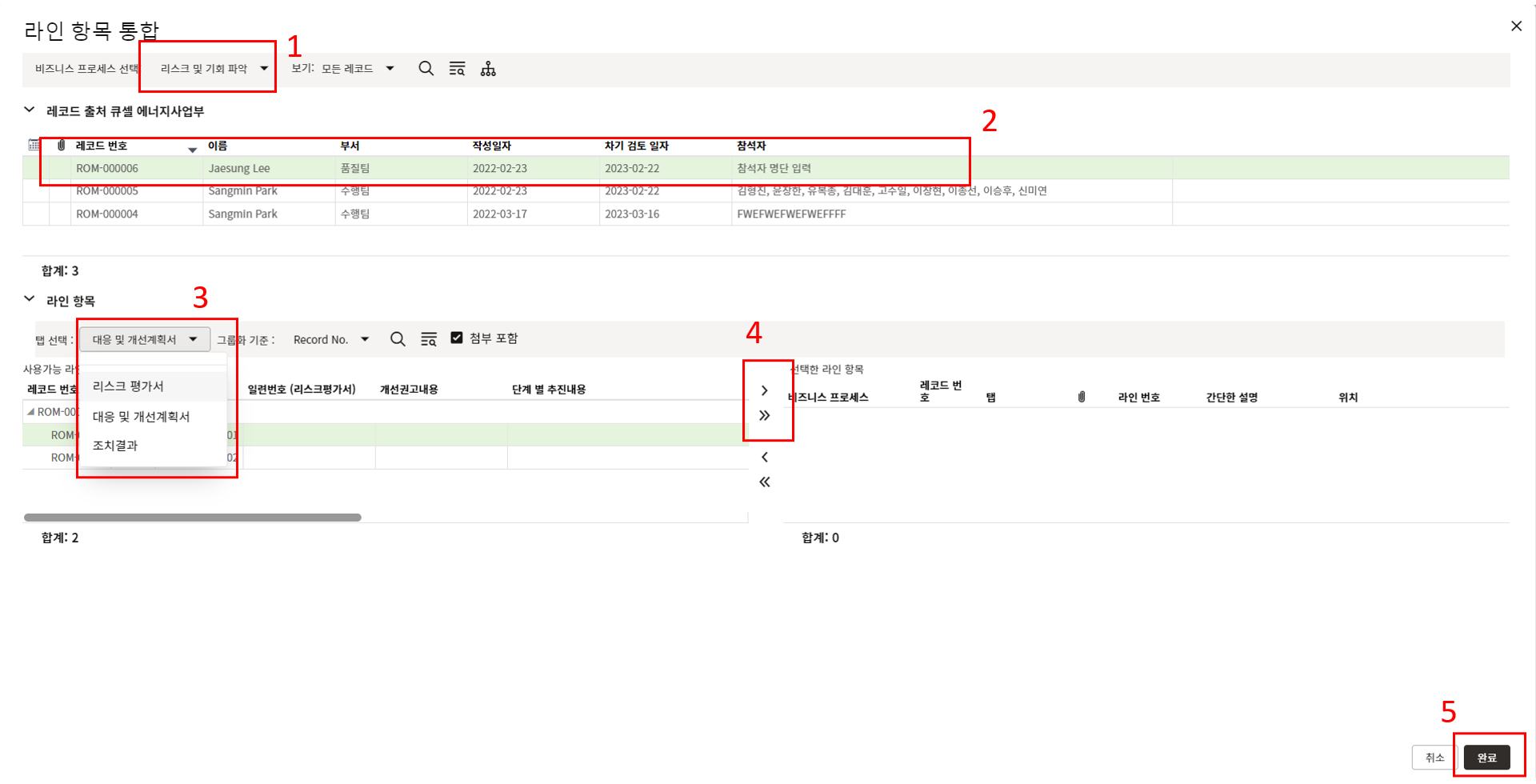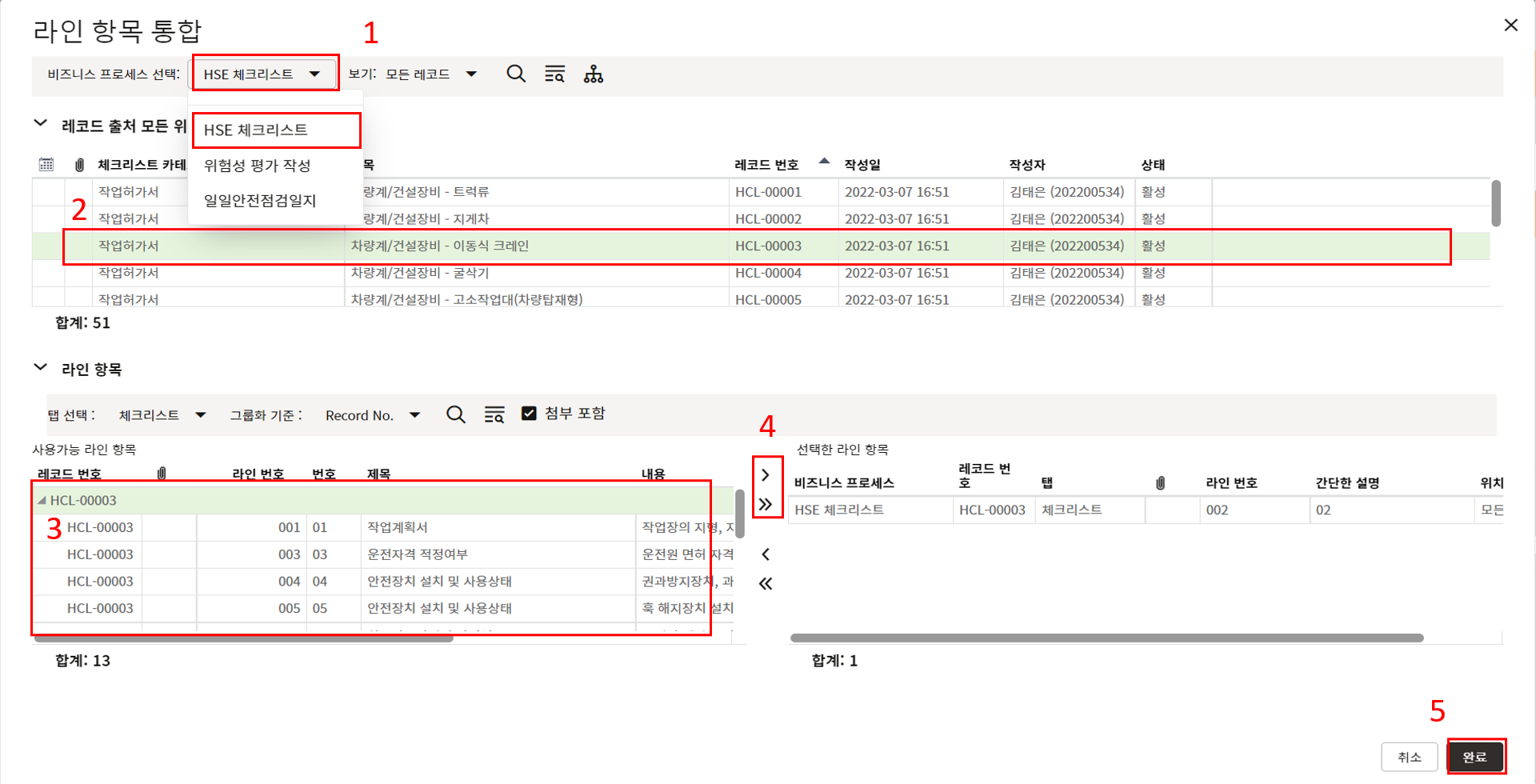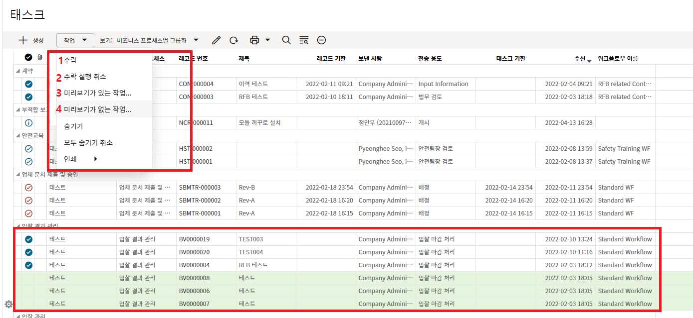 아래와 같이 여러 레코드를 선택하여, 작업버튼을 통해 여러 태스크를 동시에 완료 할 수 있습니다.