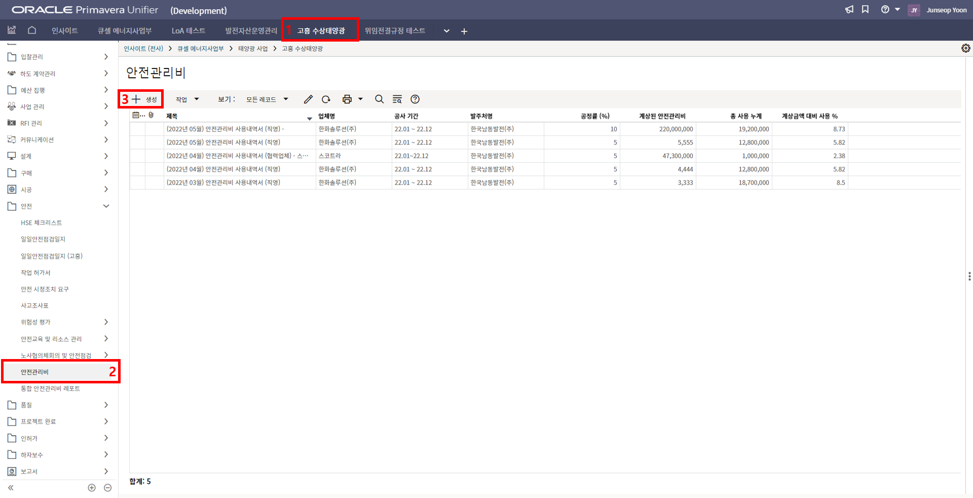 1. 안전관리비는 한화솔루션 및 협력업체들이 '월별 안전관리비 실적'을 입력하는 메뉴 입니다.