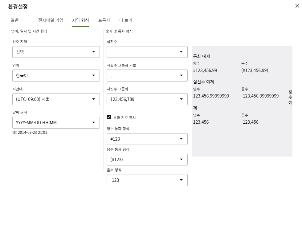 3. 지역 형식탭으로 들어가면 언어, 시간대, 숫자표현 등을 설정할 수 있습니다.