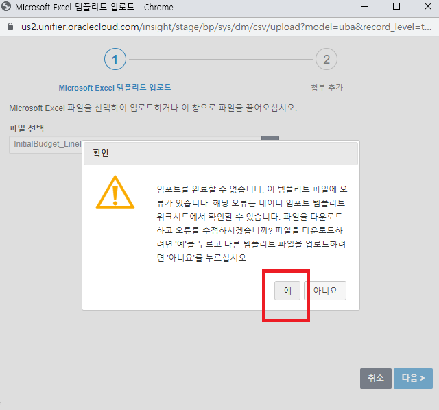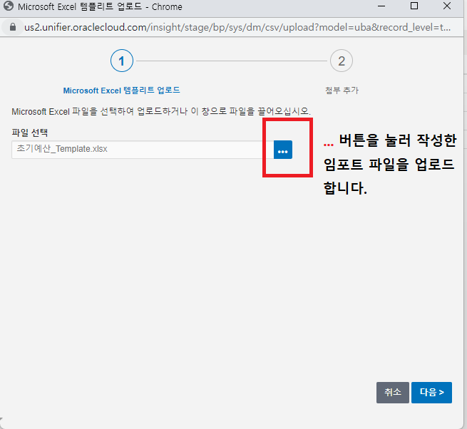 1. 임포트 파일을 업로드하고 다음 버튼을 클릭한 상황입니다.