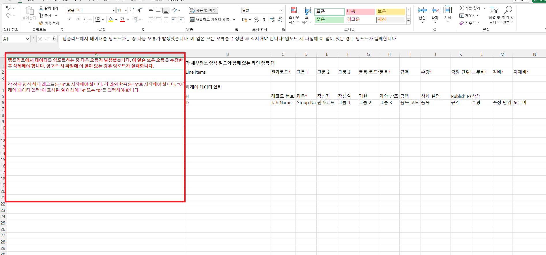 엑셀파일을 열어 "데이터 임포트 템플리트" 시트를 보면 'A'열에 오류 내용이 입력되어있습니다.