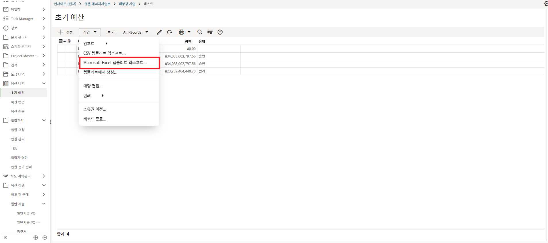 1. 로그화면의 '작업'버튼을 눌러 엑셀 임포트 양식을 다운로드합니다.