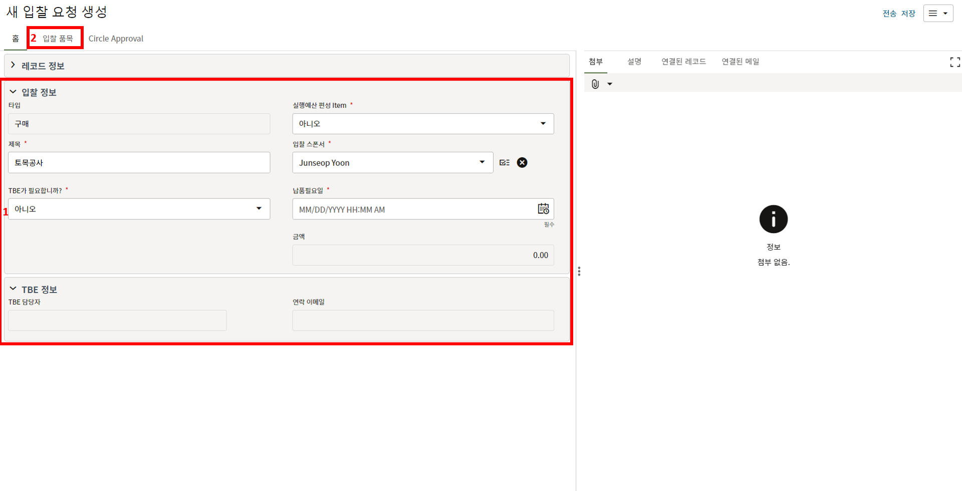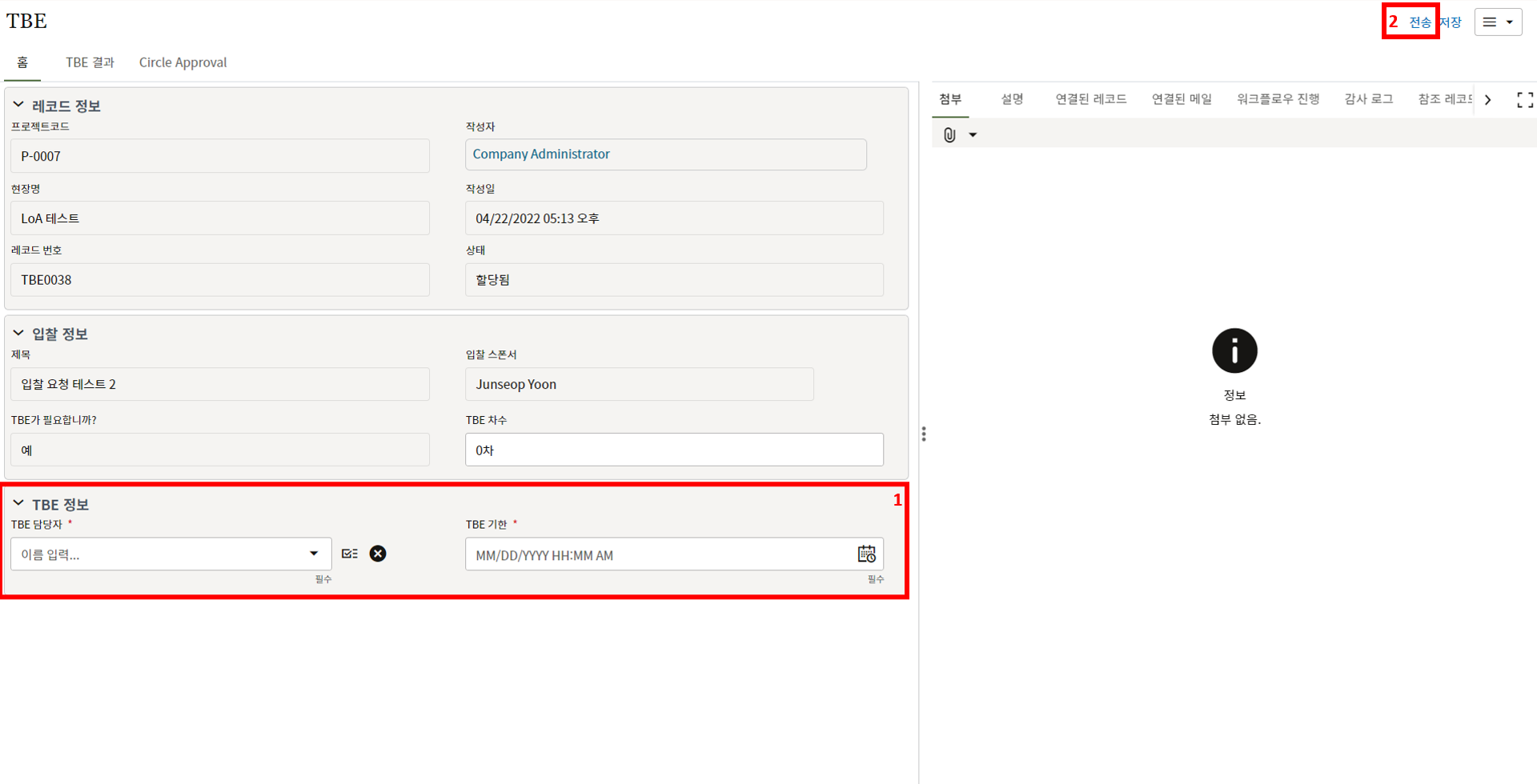 3. 상위 양식을 입력한 후 TBE 담당자에 전송합니다.