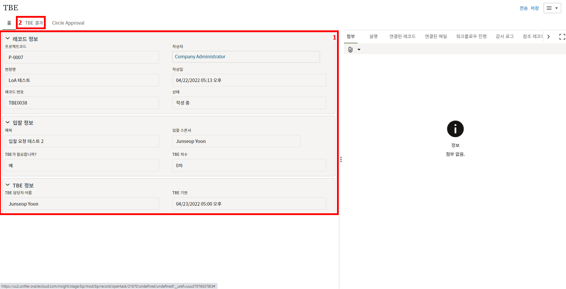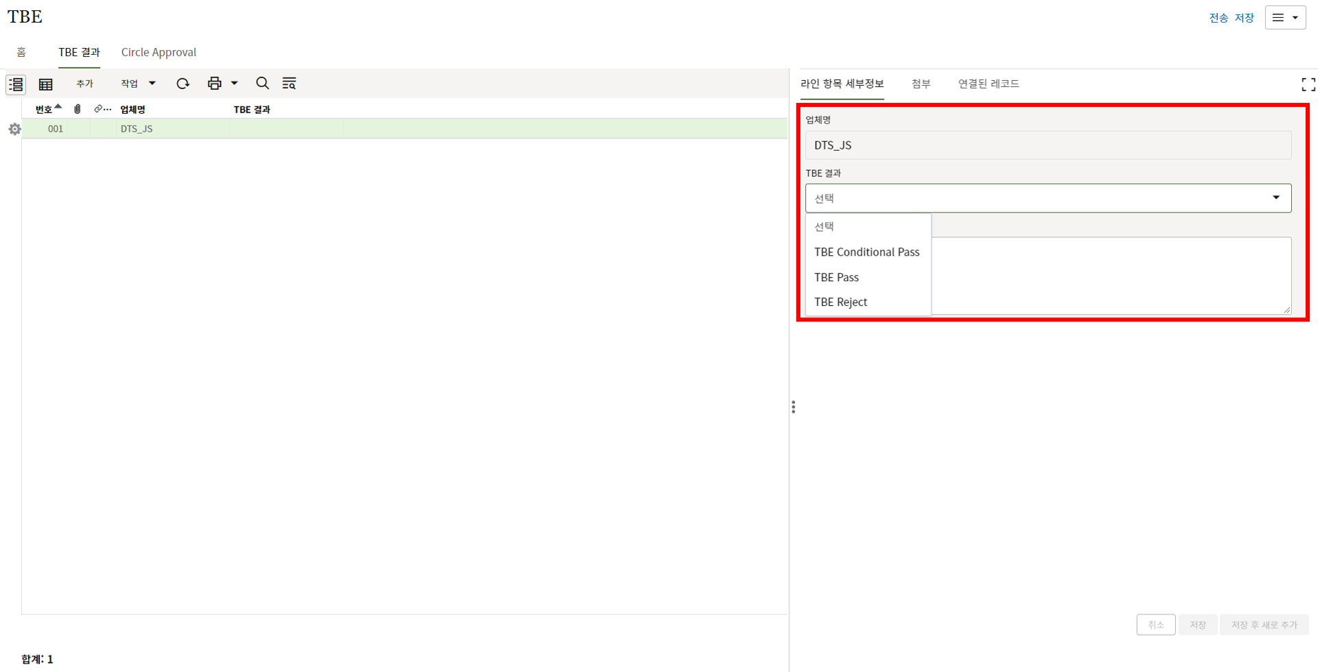 4. TBE 담당자는 상위 양식을 확인 후 결과 입력을 위해 "TBE 결과" 탭으로 이동합니다.