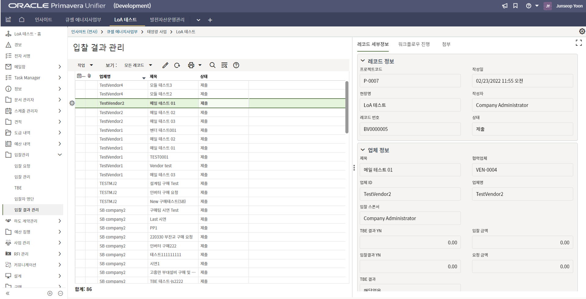 5. "TBE 결과" 탭에서 입찰 업체를 확인한 후 TBE 결과를 선택합니다.