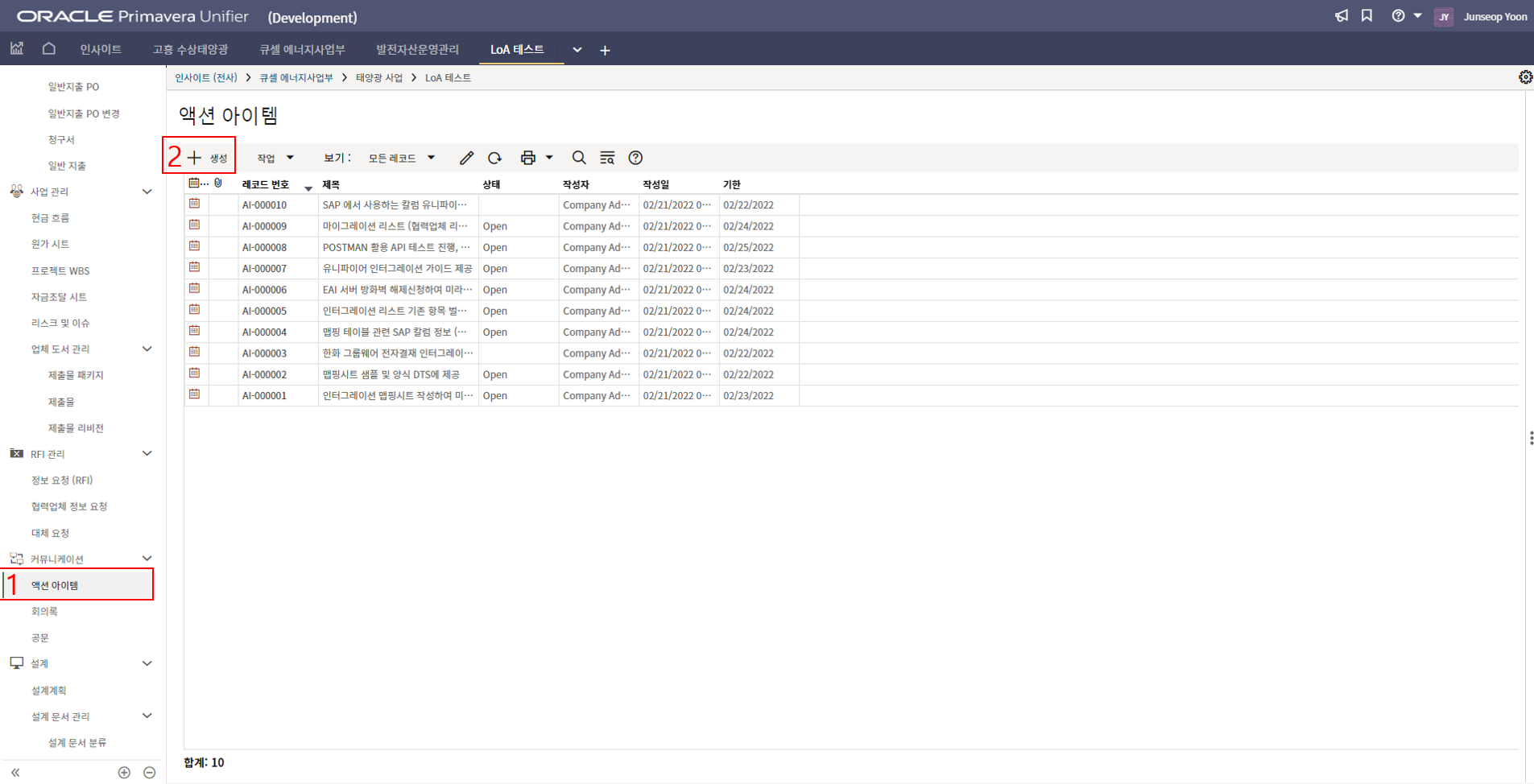 2.'1)액션 아이템 > 2) 생성'를 클릭합니다.