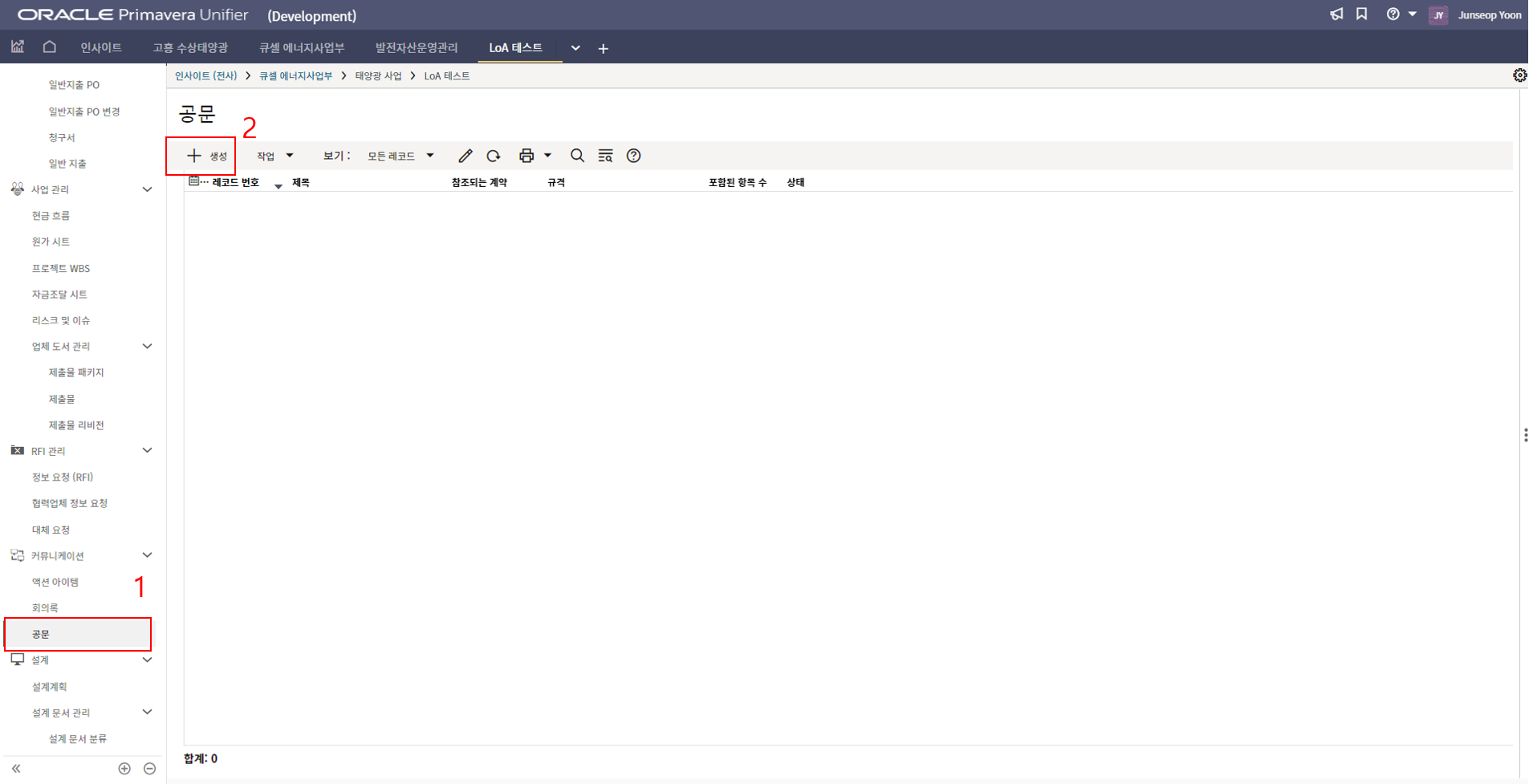 2.'1)공문 > 2) 생성'를 클릭합니다.
