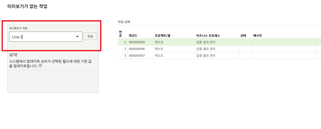 4) '미리보기가 없는 작업'은 레코드 내용을 확인없이 워크플로우를 넘기는 기능입니다.