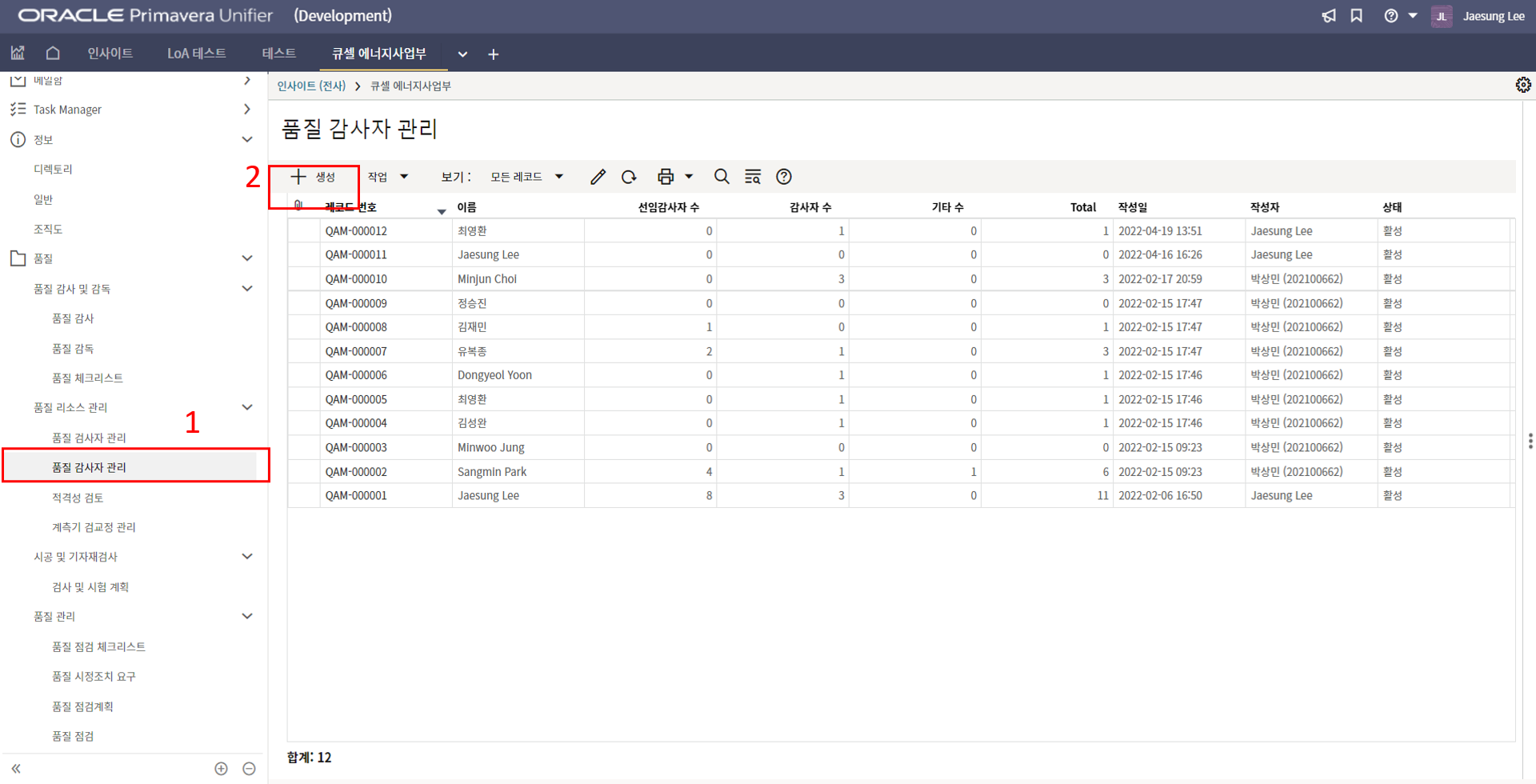 12. 검사결과 입력이 완료되면 품질담당자에게 검사결과를 전송합니다.
