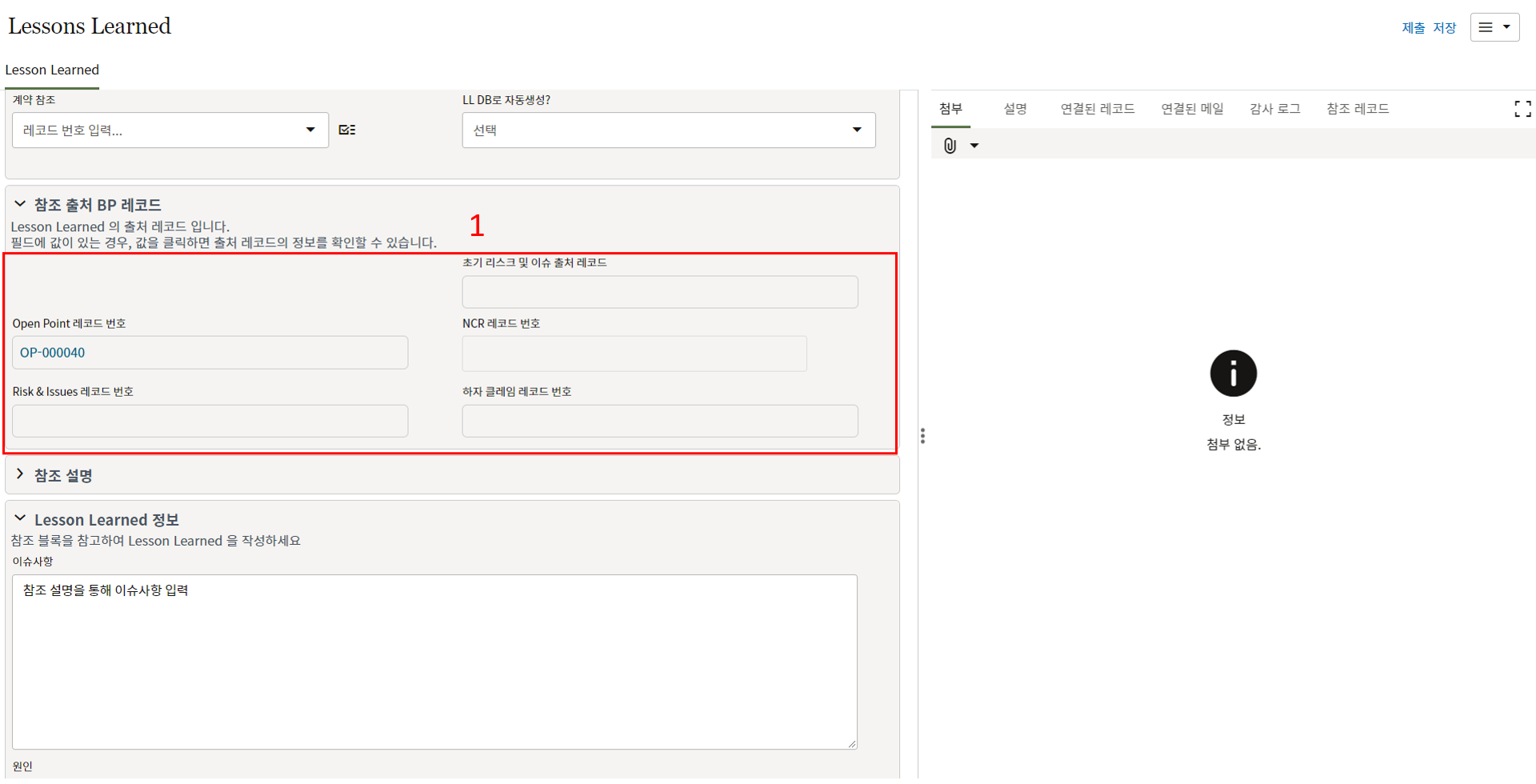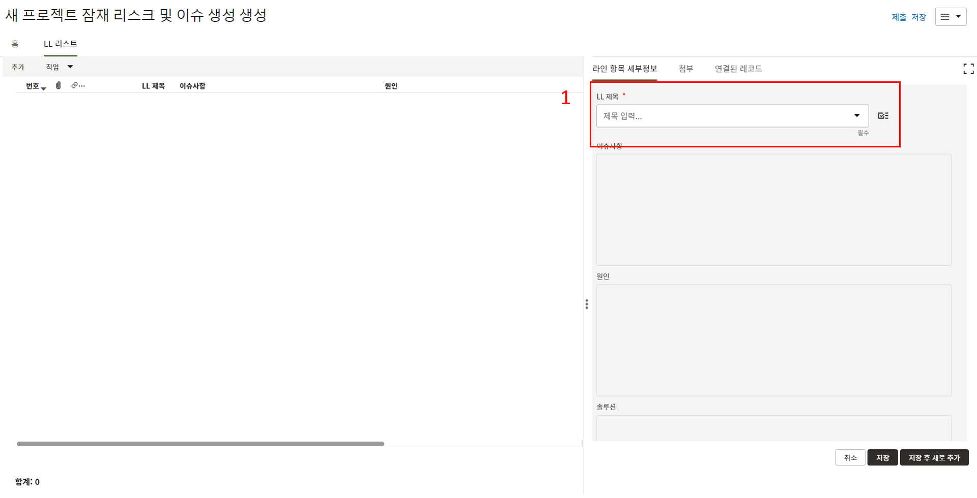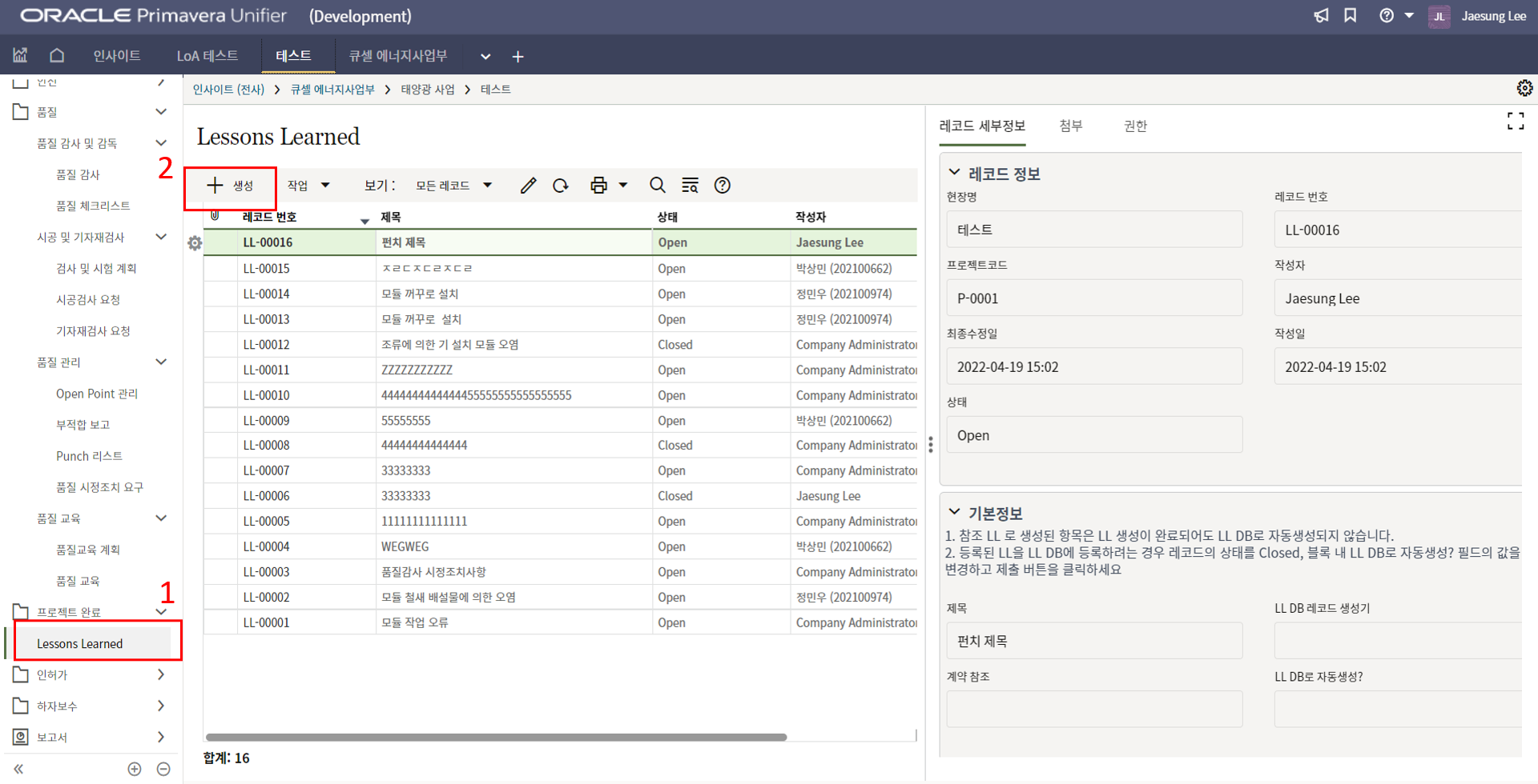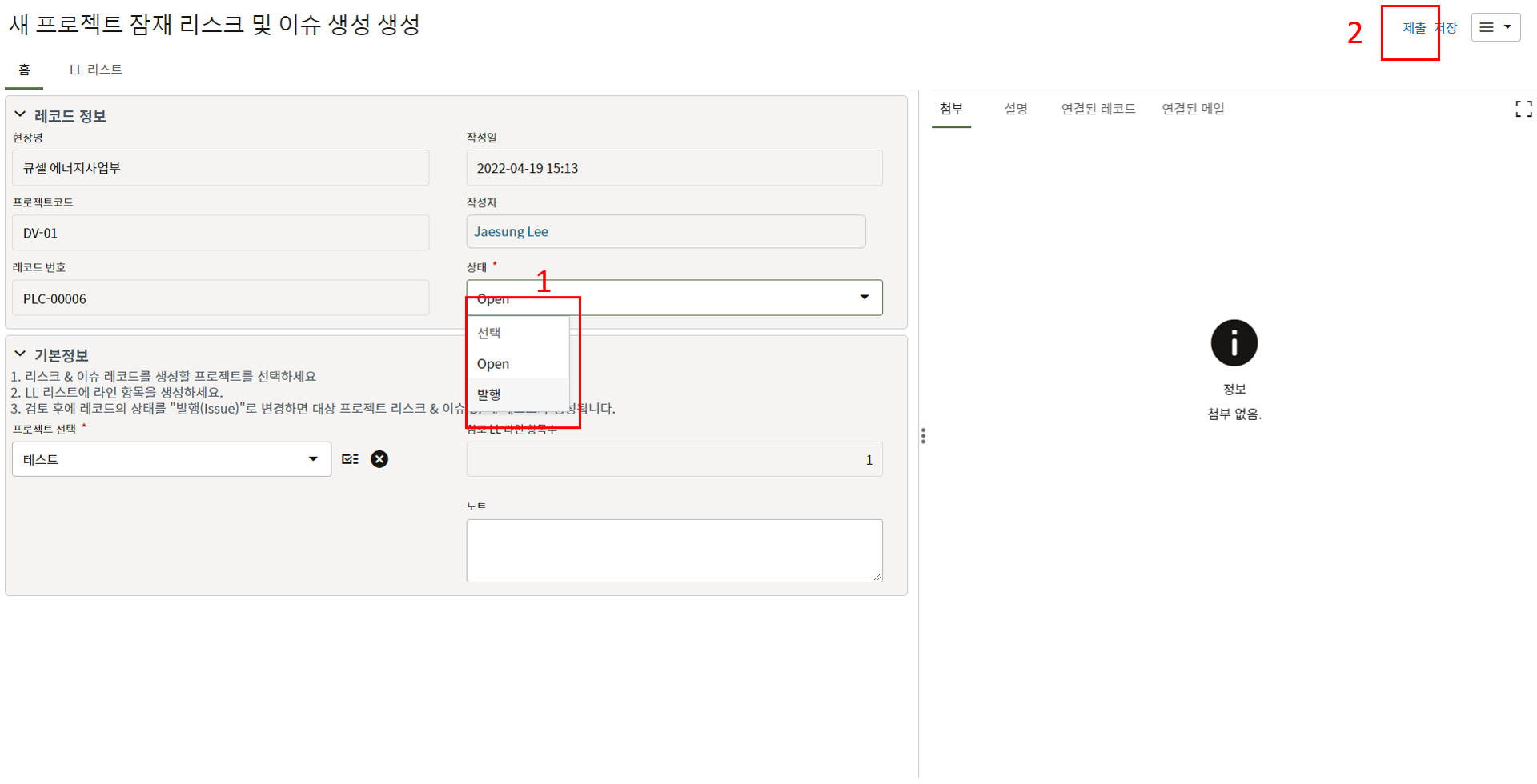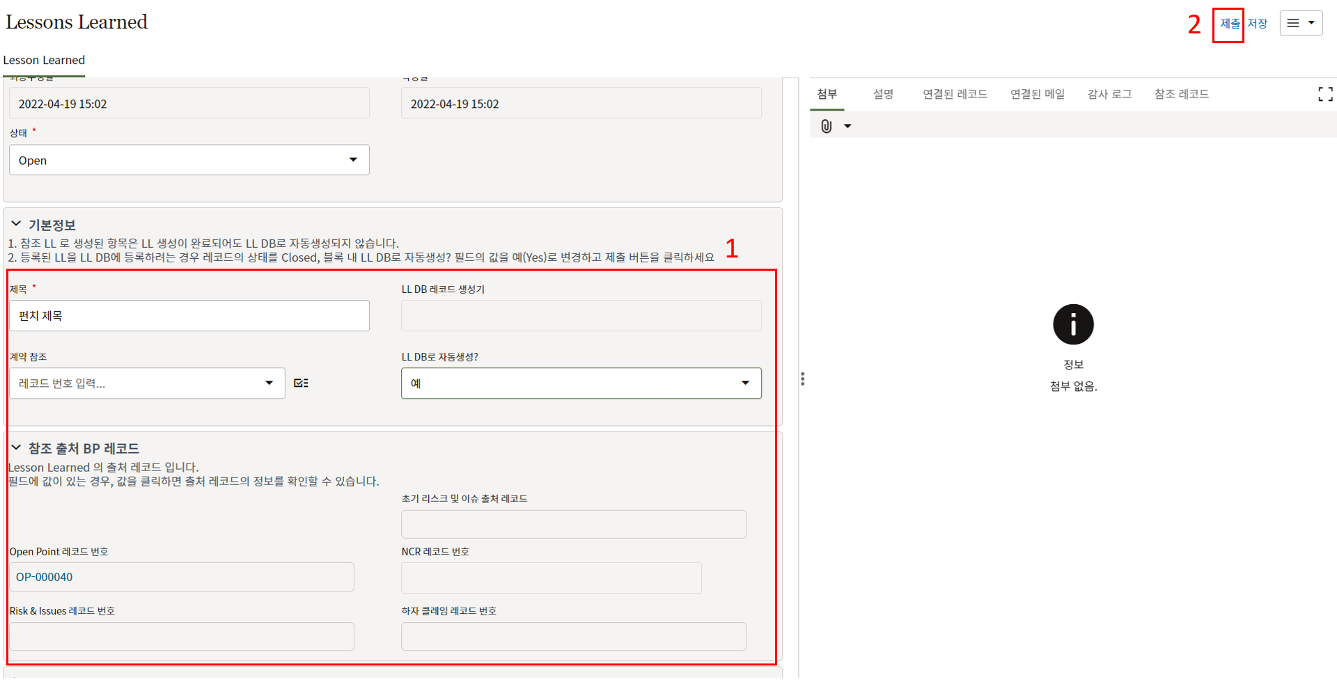 5. LL DB로 자동생성? 필드에 '예'를 선택하고 상태를 Closed로 변경하면 해당 LL이 Lessons Learend DB에 저장됩니다.