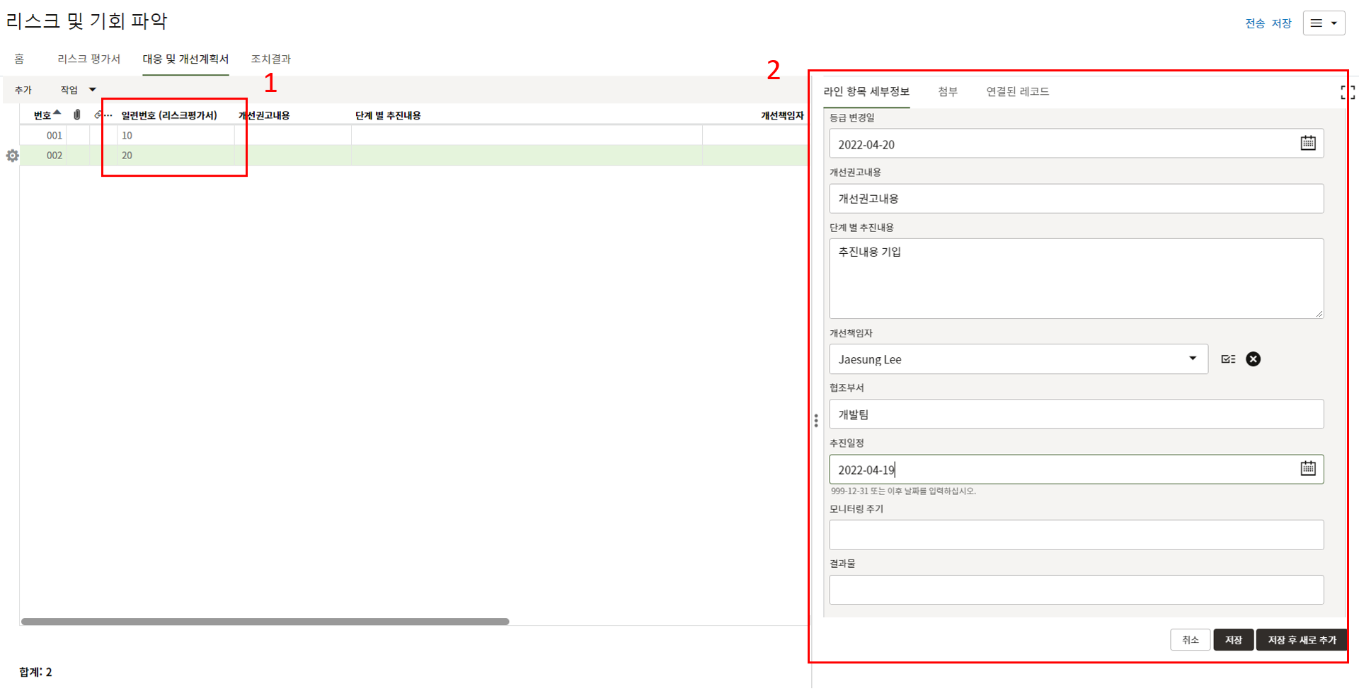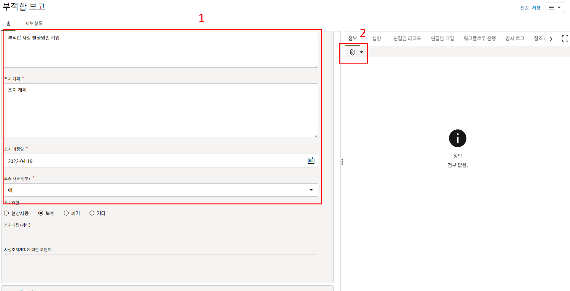 4. 부적합 조치 담당자는 조치계획을 업데이트하고 보충자료를 첨부합니다.