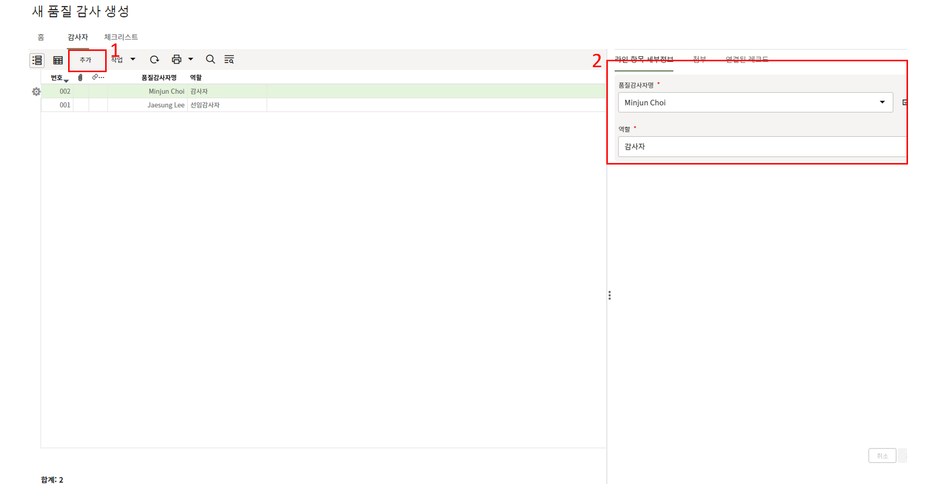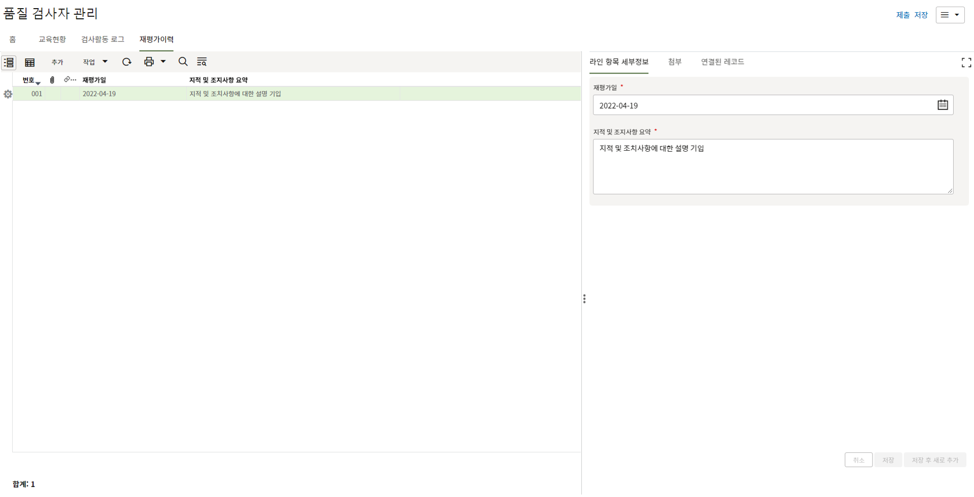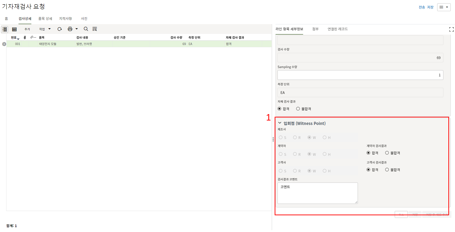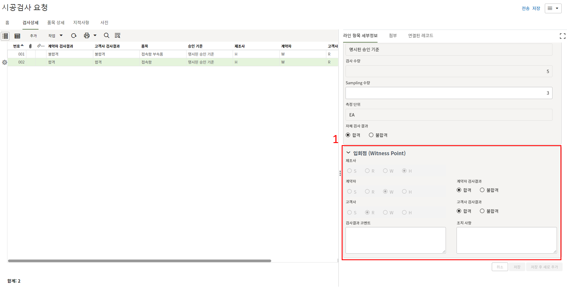 9. 검사자는 검사상세 탭에서 검사결과를 업데이트 합니다.