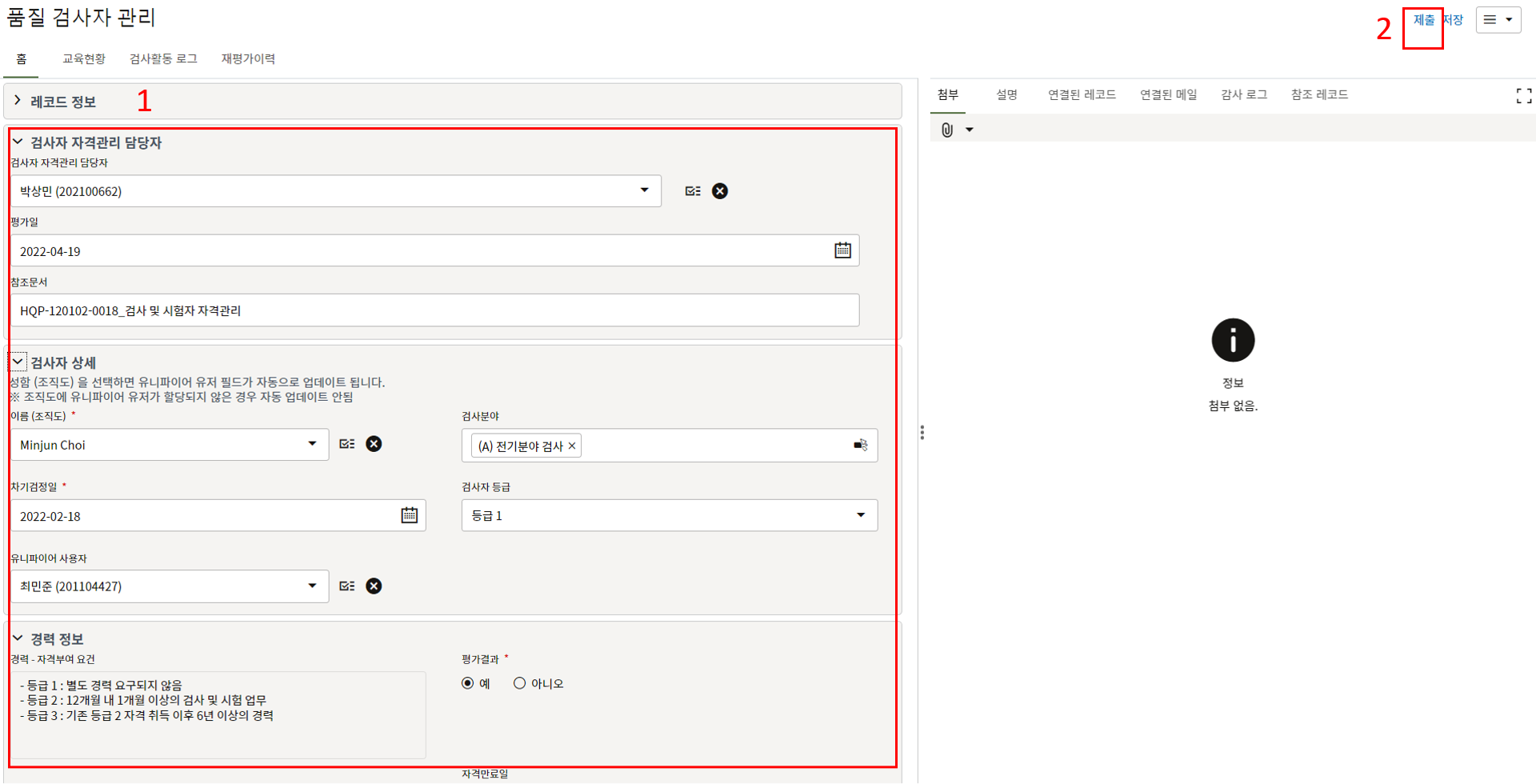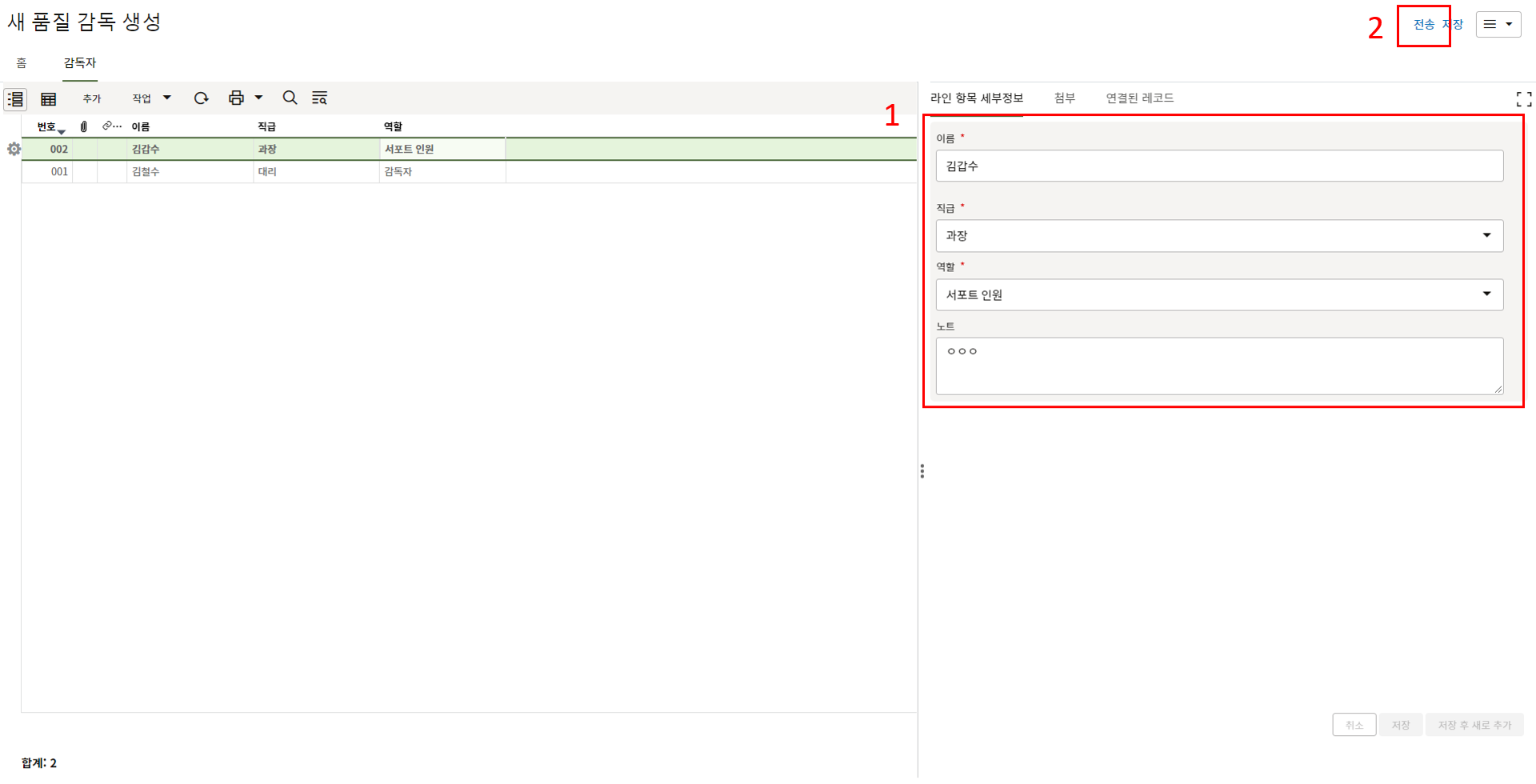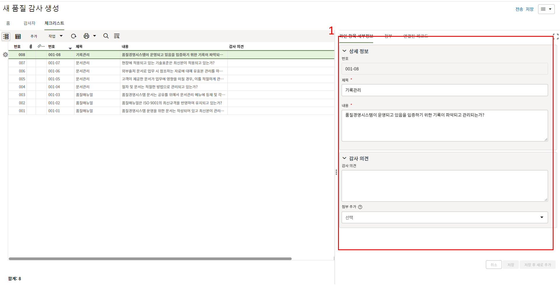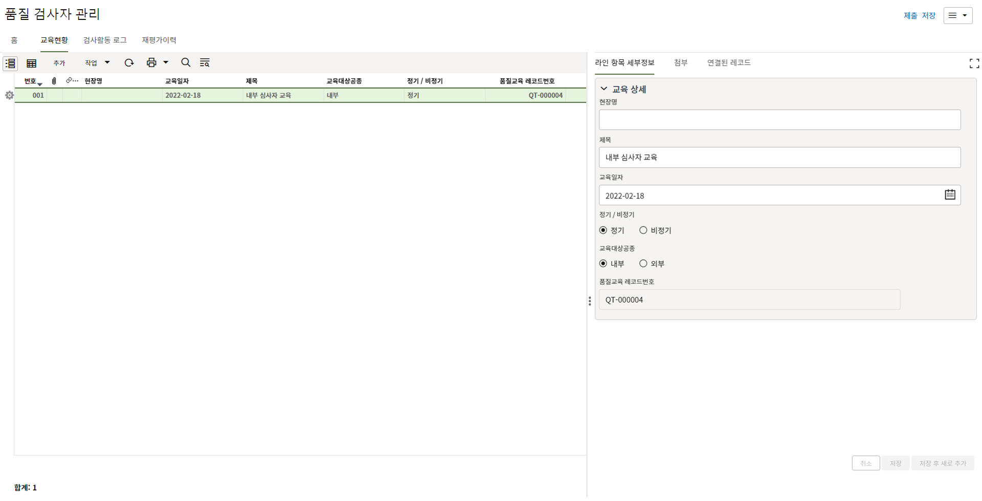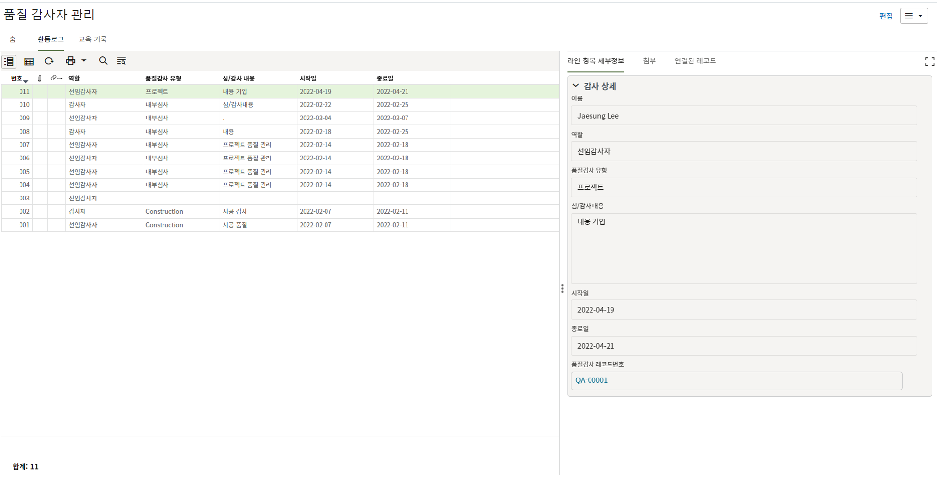 9. 검사자는 검사상세 탭에서 검사결과를 업데이트 합니다.