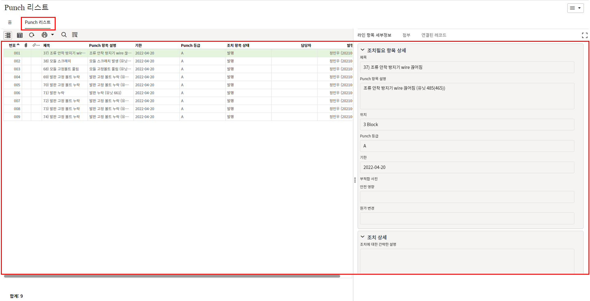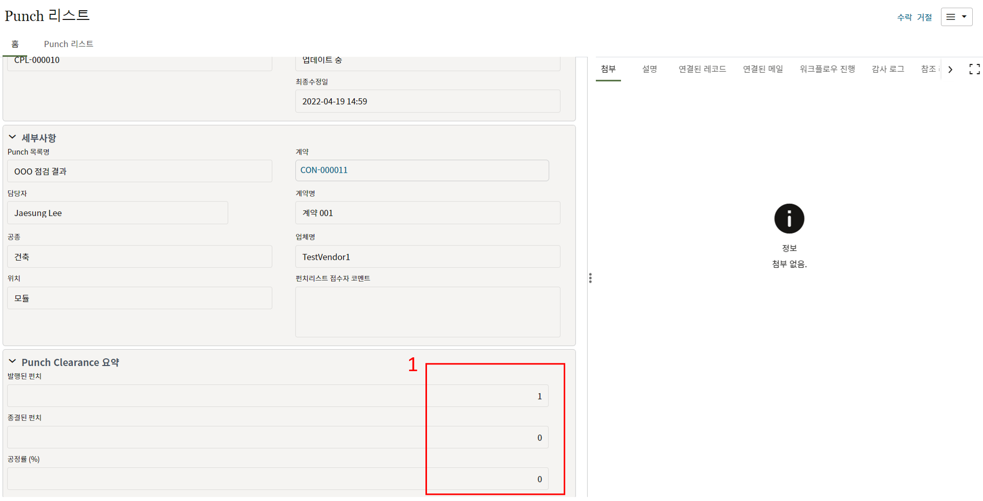 2. 협력업체 담당자는 "Punch 리스트" 탭에서 상세내용을 검토 후 수정요구 및 승인을 할 수 있습니다.