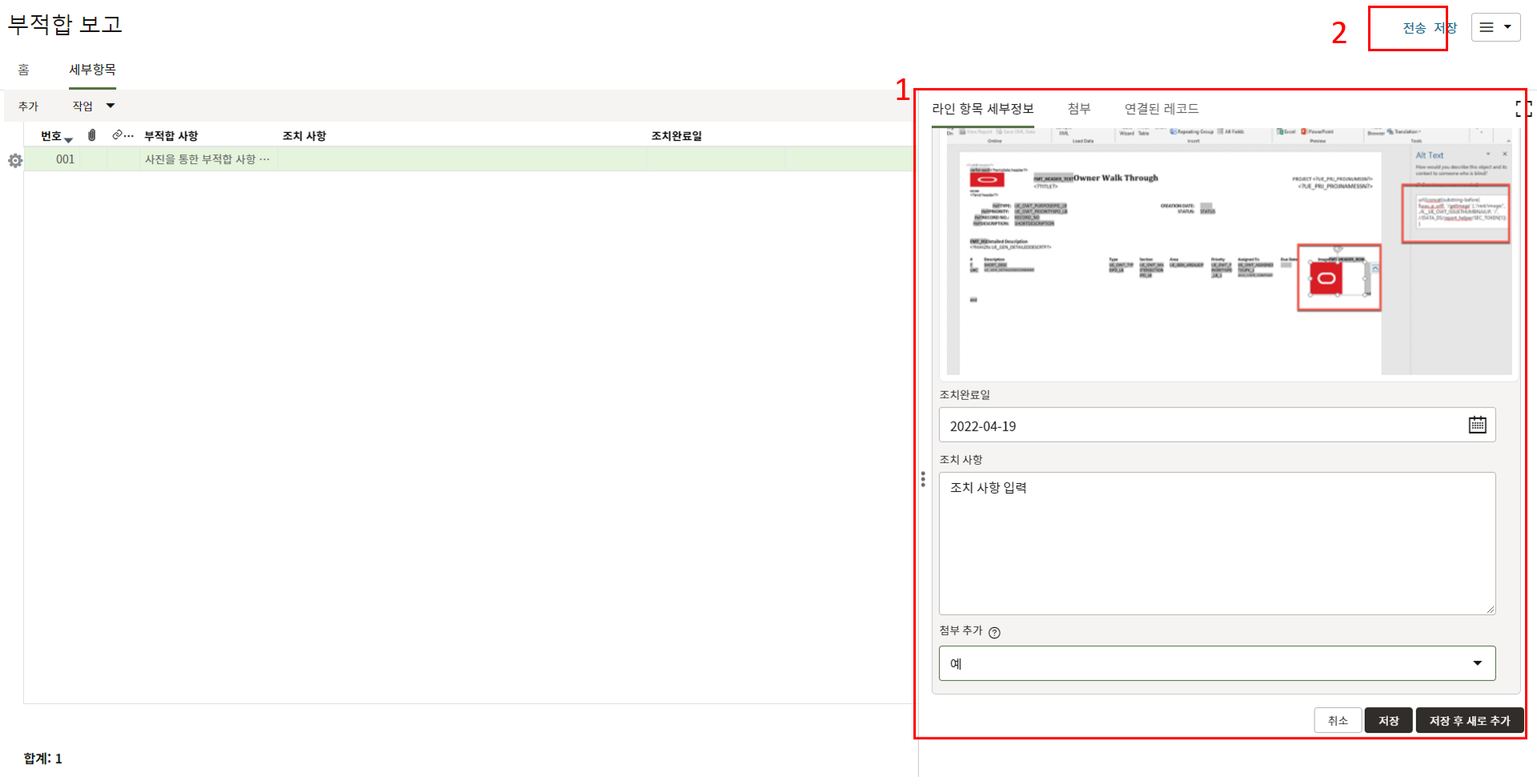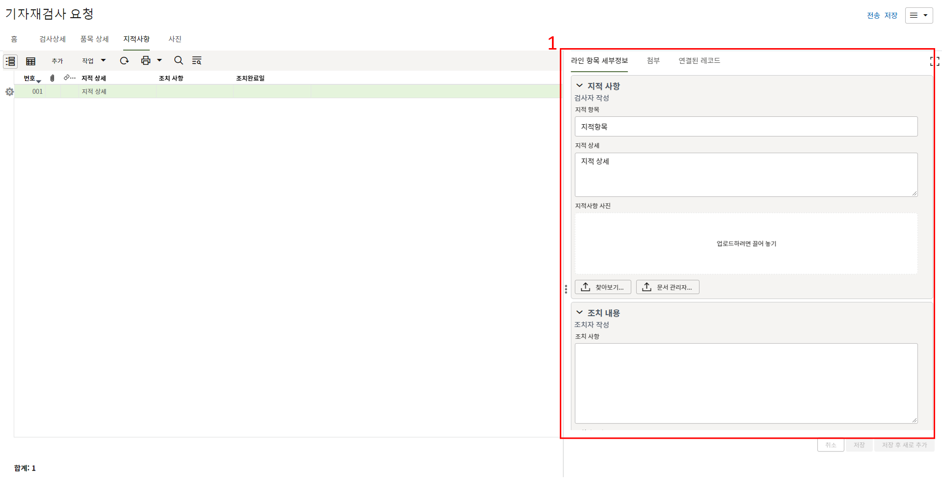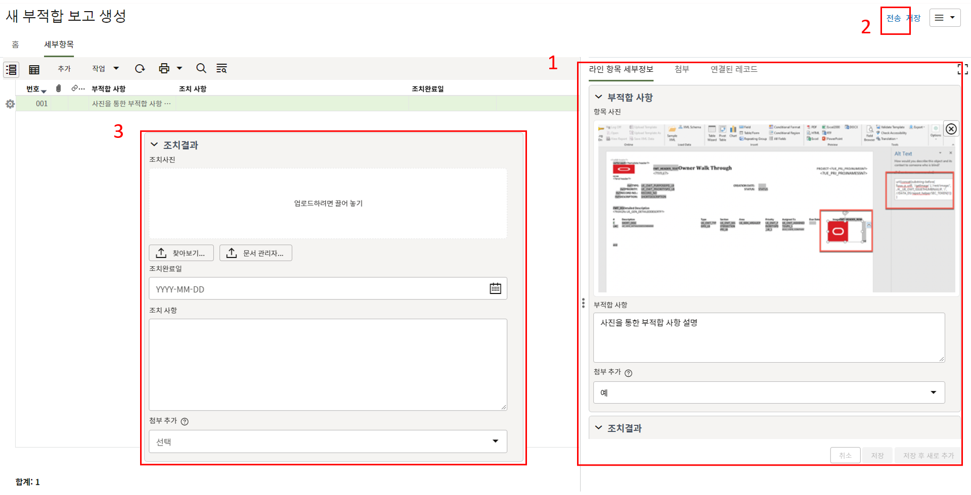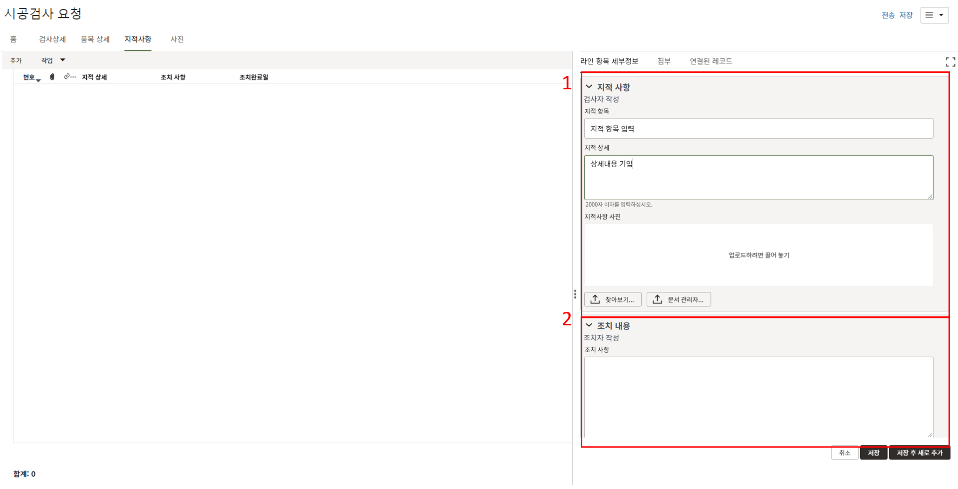 2. "세부항목" 탭에서 부적합 내용에 대한 사진을 등록하고 조치결과를 기록합니다.