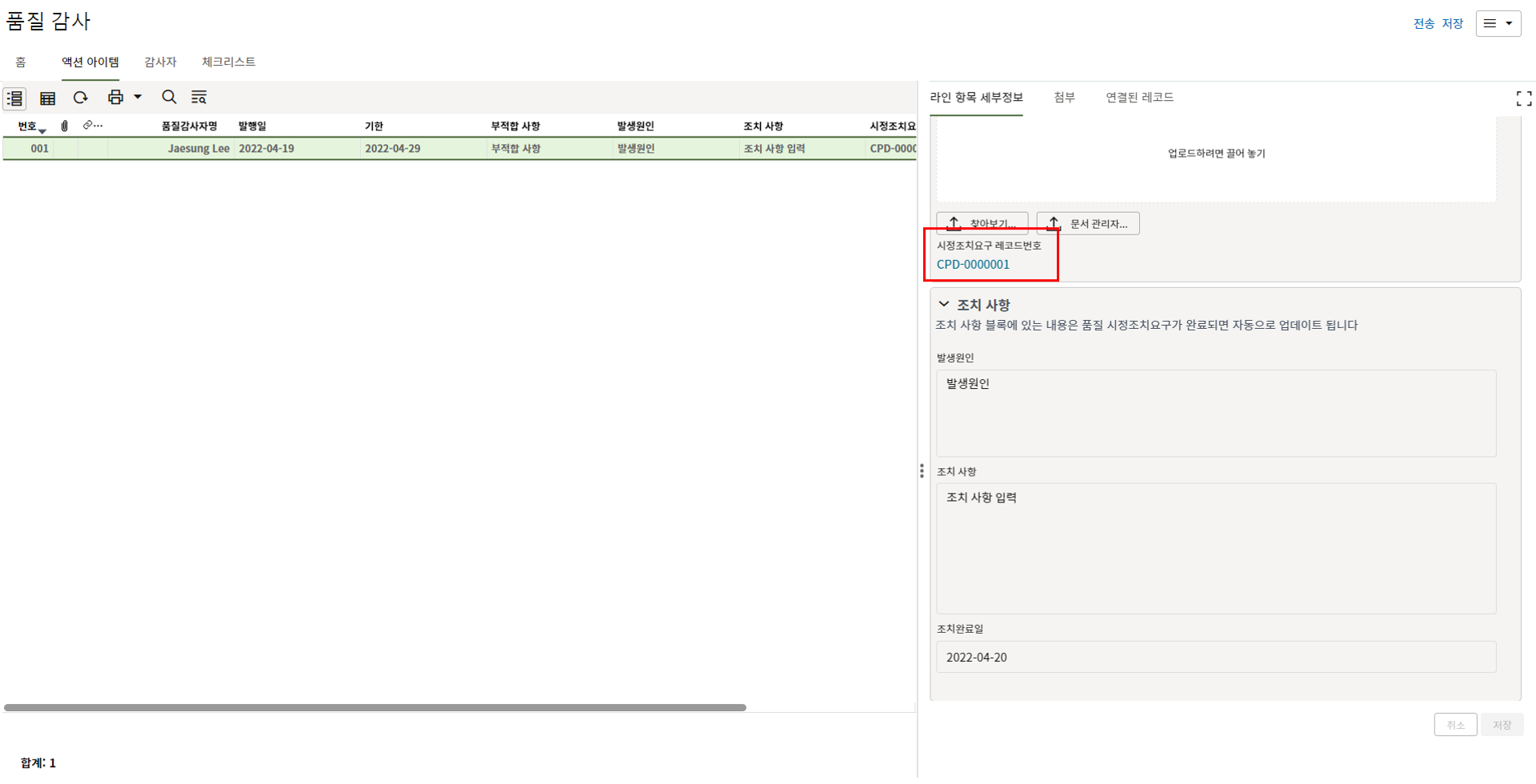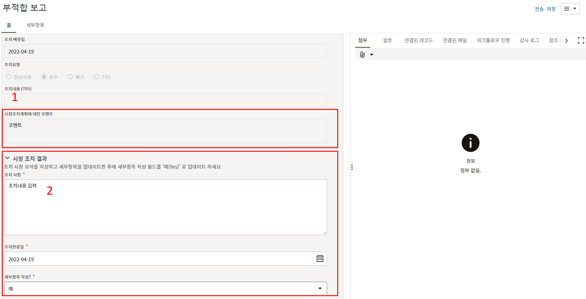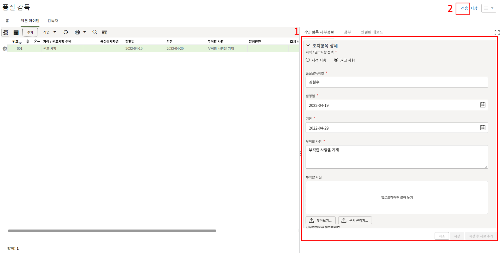 2. "세부항목" 탭에서 부적합 내용에 대한 사진을 등록하고 조치결과를 기록합니다.
