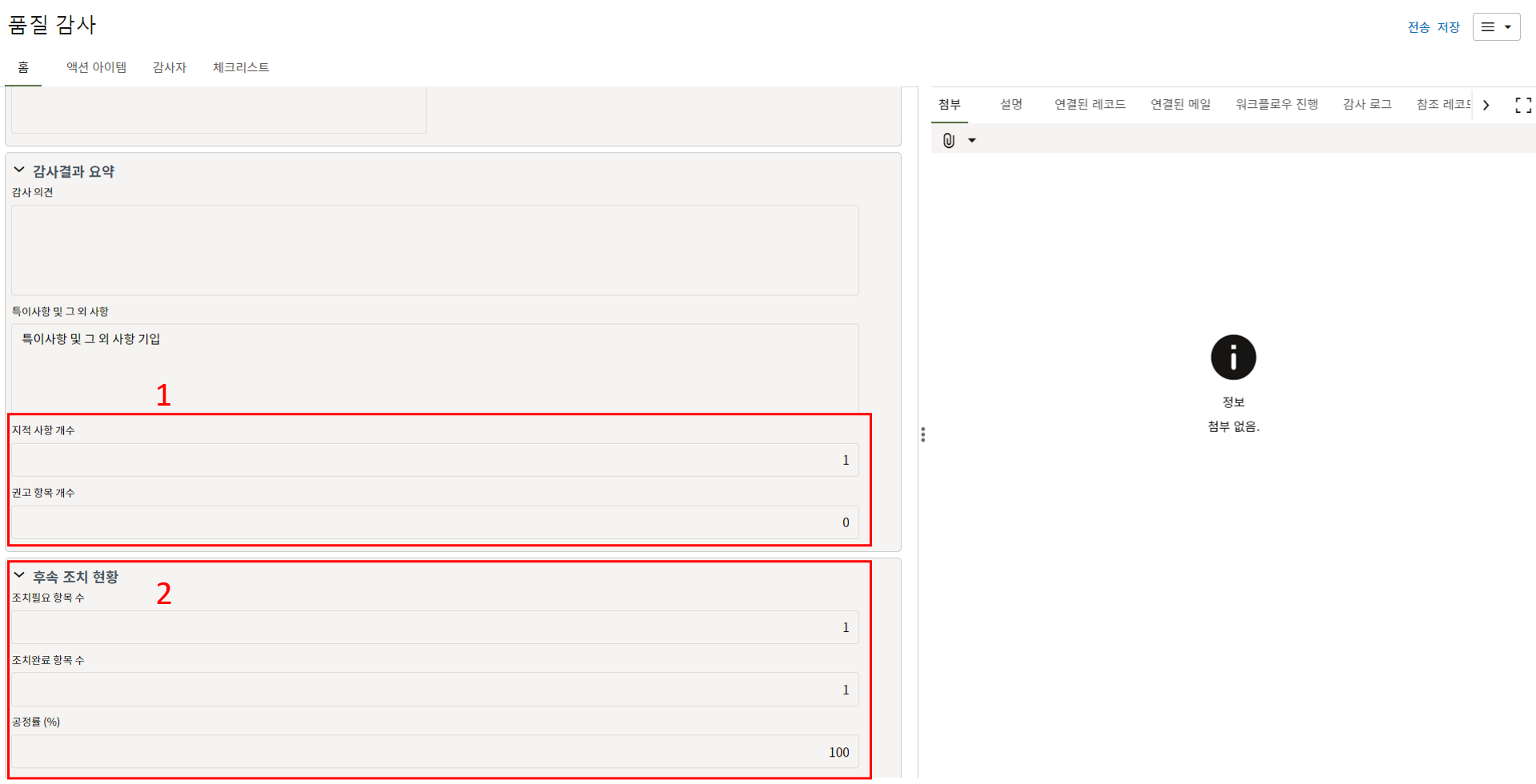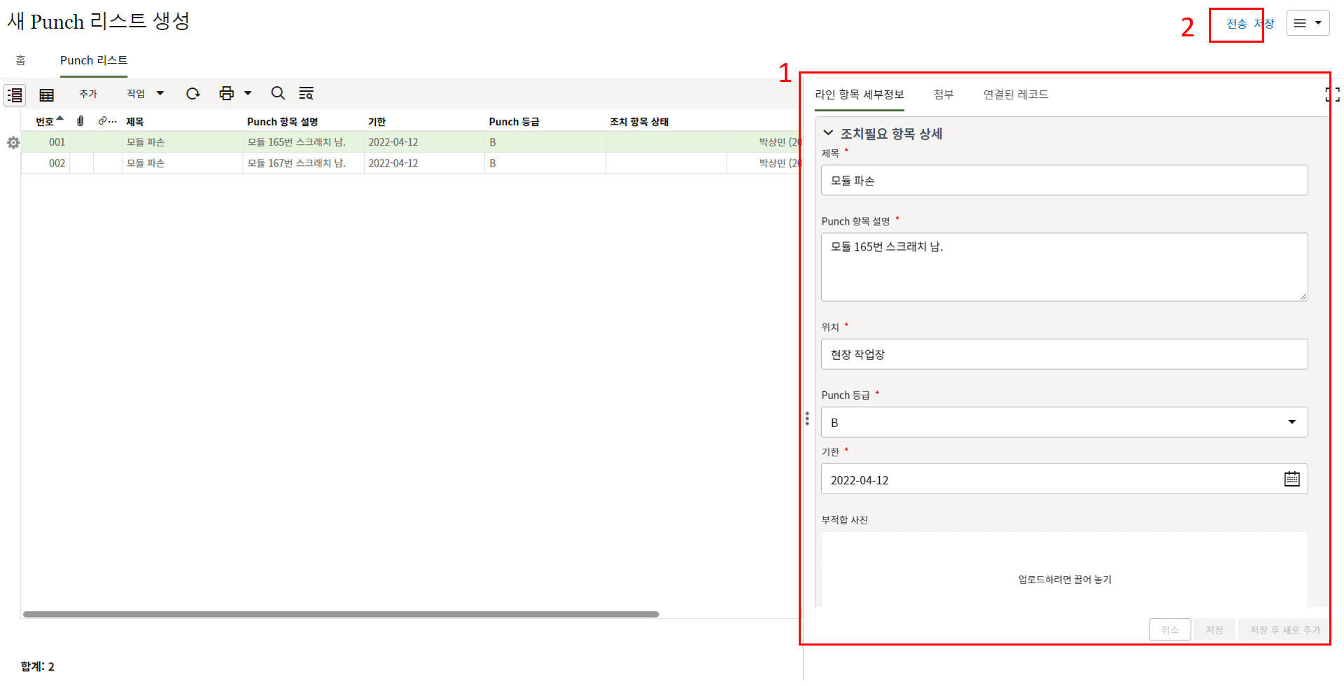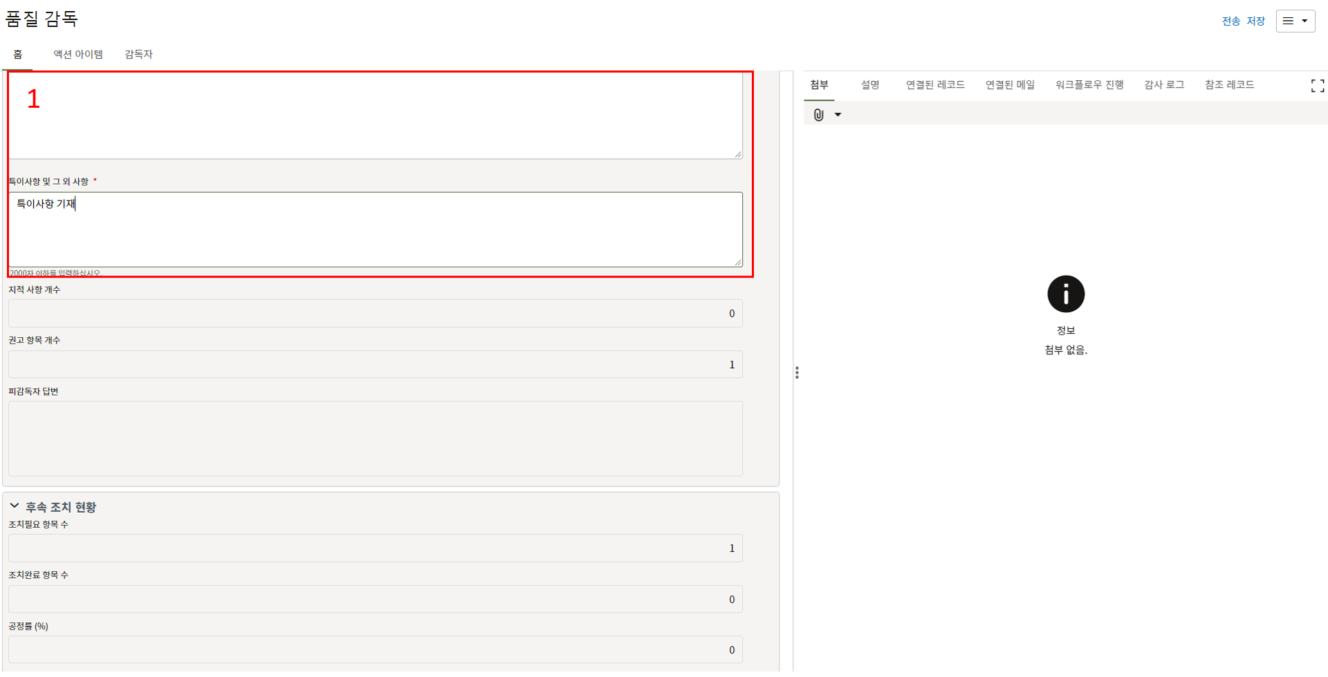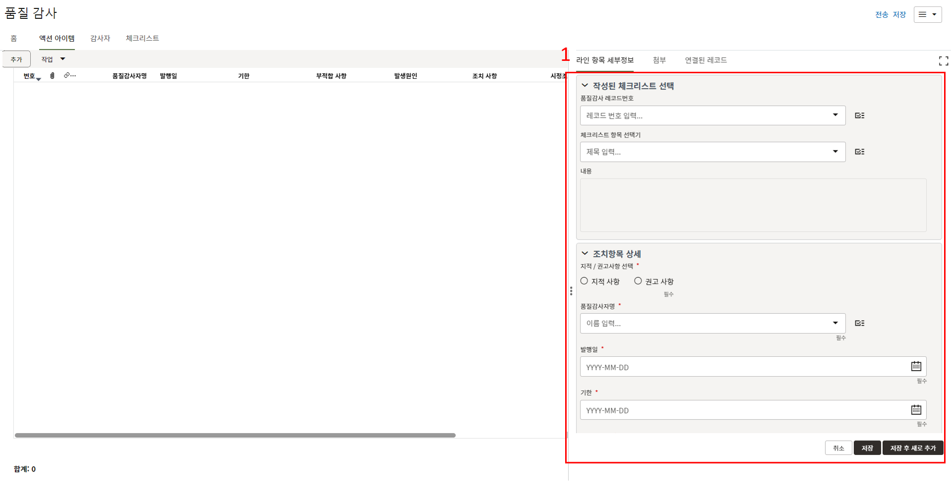 2. "세부항목" 탭에서 부적합 내용에 대한 사진을 등록하고 조치결과를 기록합니다.