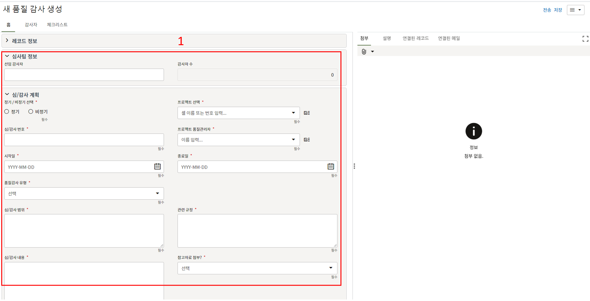 3. 검사 요청 내용을 작성합니다. 이전 검사 요청이 불합격된 경우 요청 내용이 자동생성되며 식오검사 출처 레코드 번호 항목에