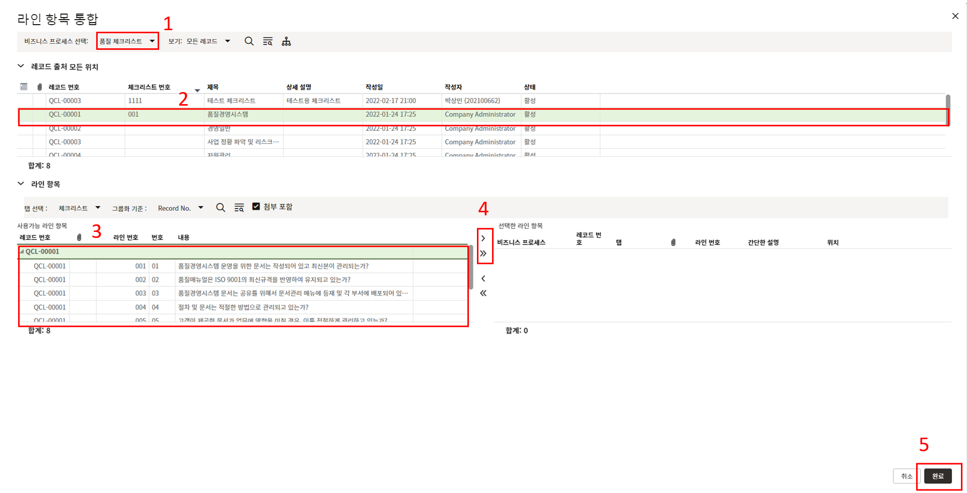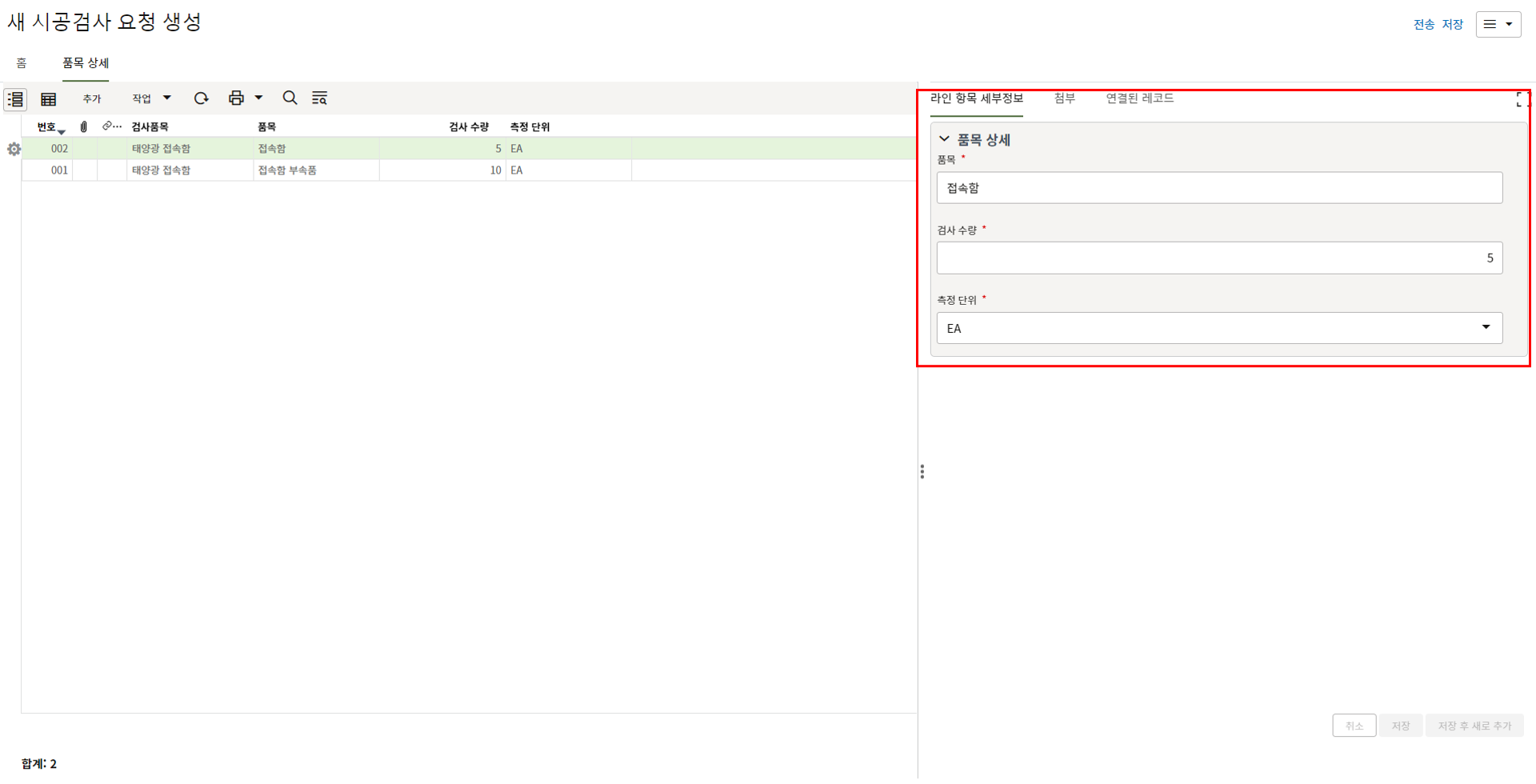 7. 품목 상세에서 품목과 검사 수량을 입력합니다.