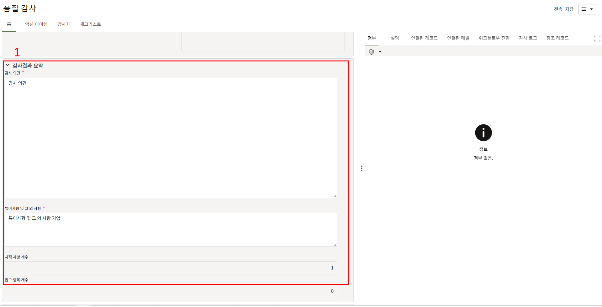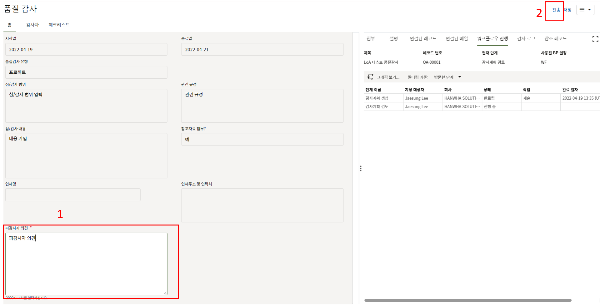 13. 검사결과에 대한 의견을 검토자 코멘트에 입력하고 제출하여 검사활동을 완료합니다.