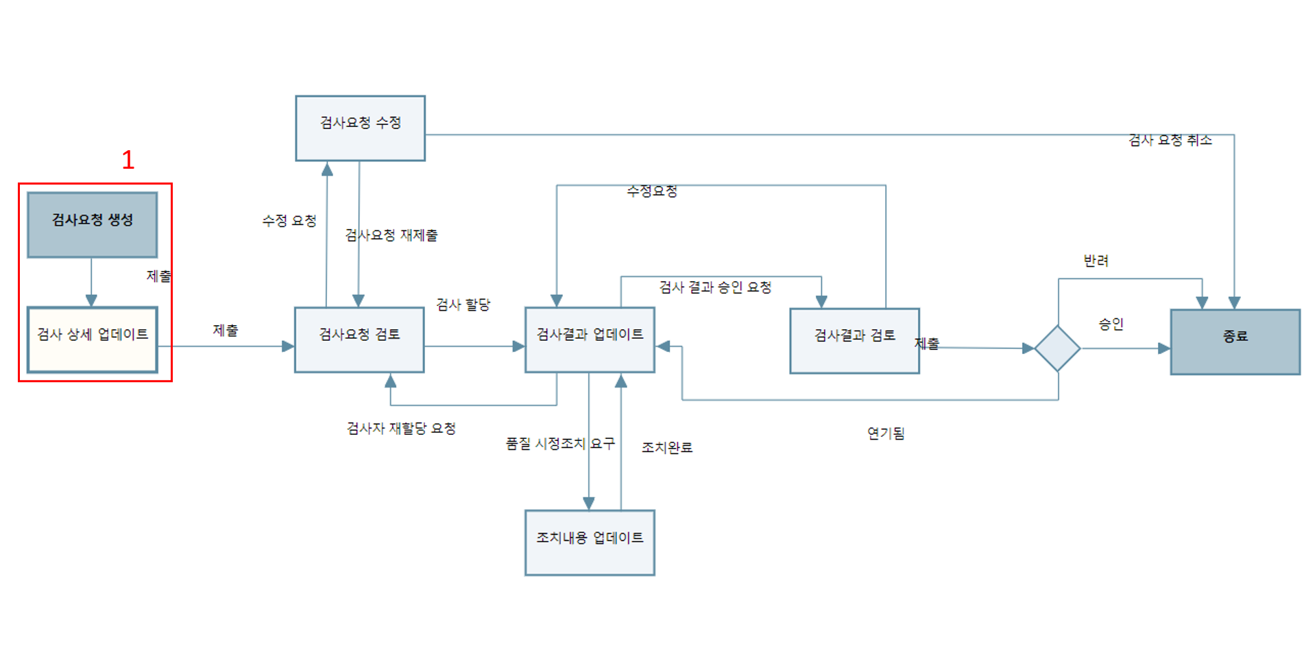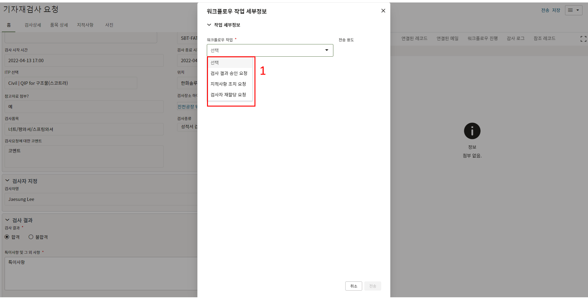 8. 검사요청을 수신하면 내용을 검토 후 수정요청 및 검사자를 지정하여 검사 결과 업데이트 스텝으로 전송할 수 있습니다.