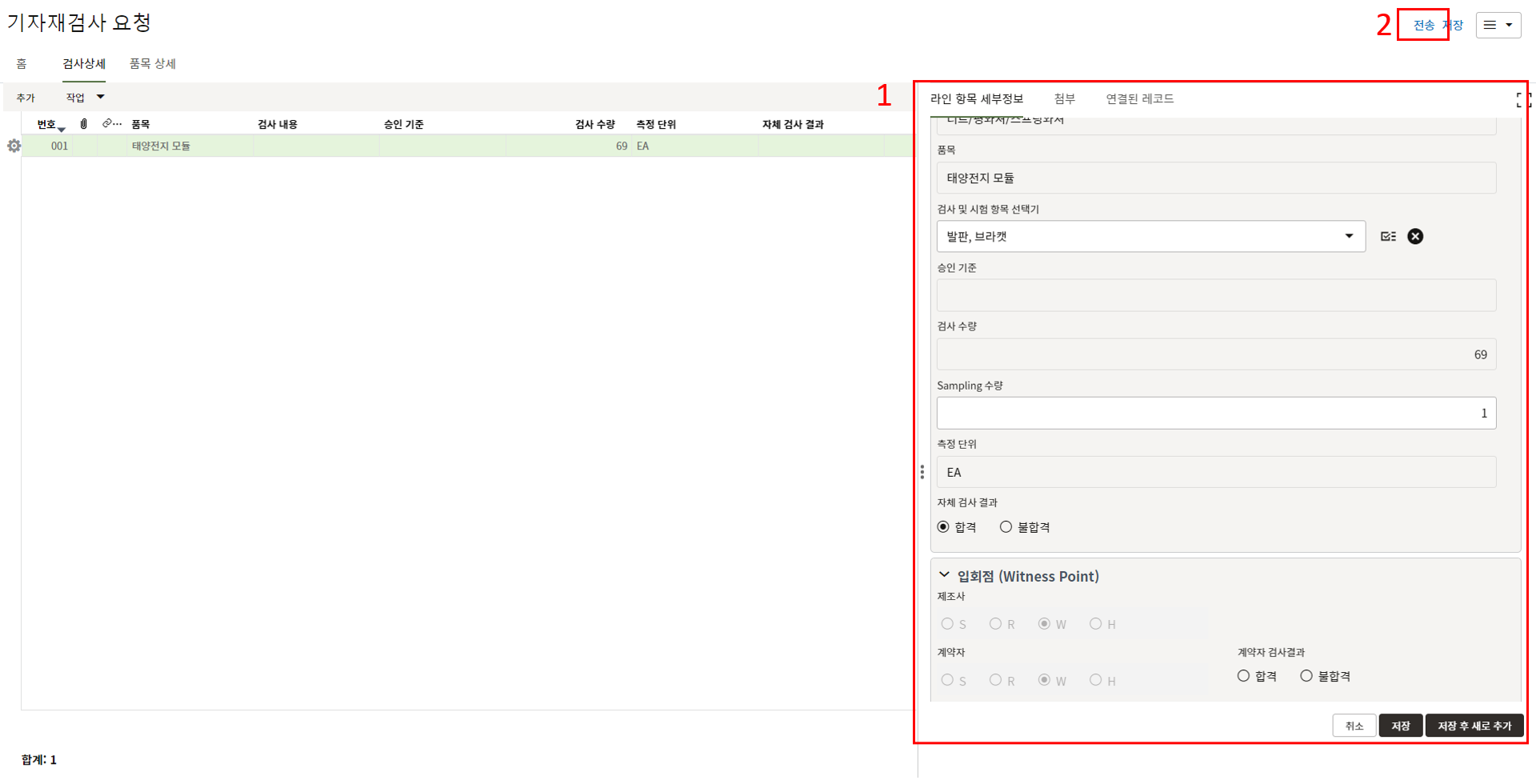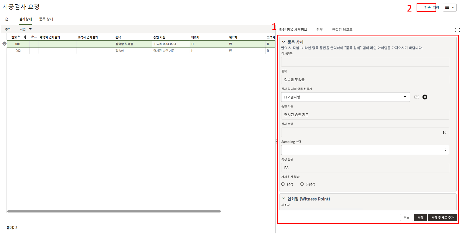 8. 전송을 눌러 스텝을 넘기면 품목 상세에 입력한 항목이 검사상세에 자동 생성됩니다. ITP 정보 및 Sampling 수량을 입력합니다.