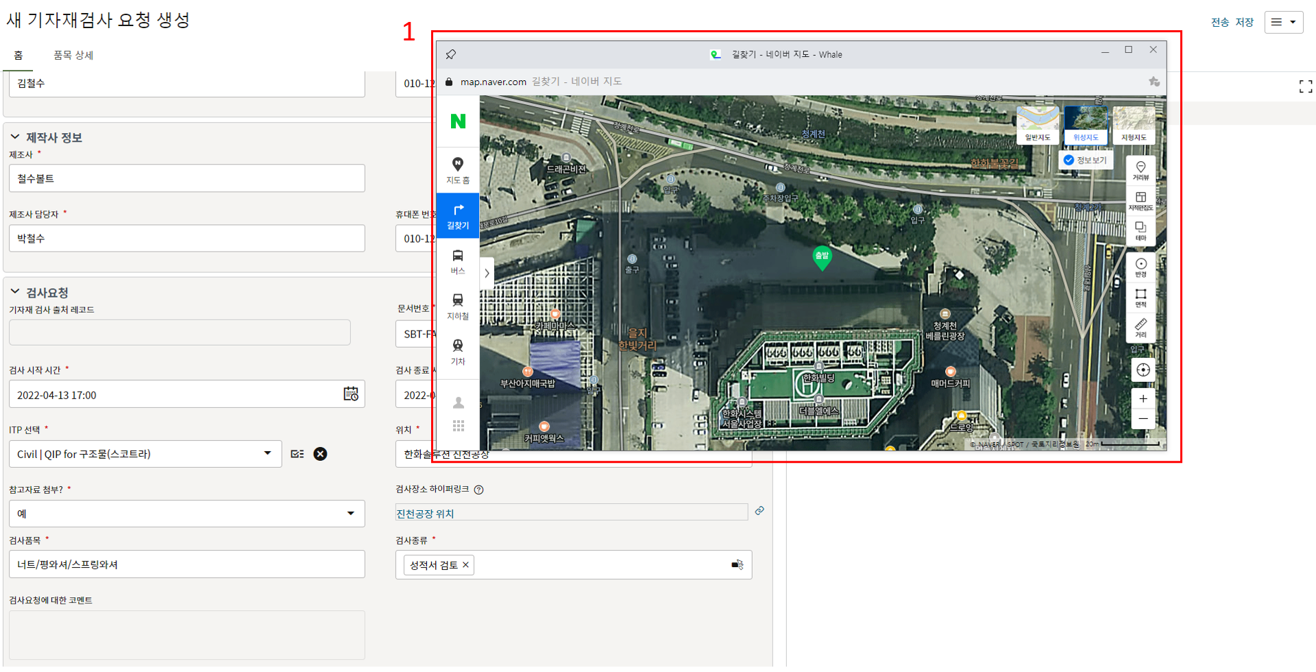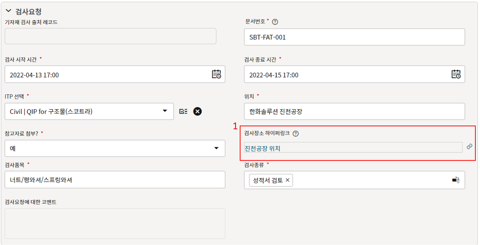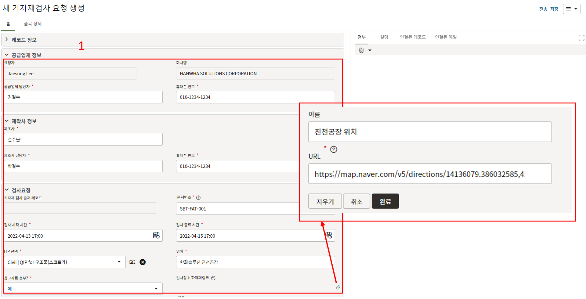 3. 요청 정보를 작성합니다. 공장 위치는 검사장소 하이퍼링크 옆 링크아이콘을 클릭하여 위치 URL을 등록합니다.