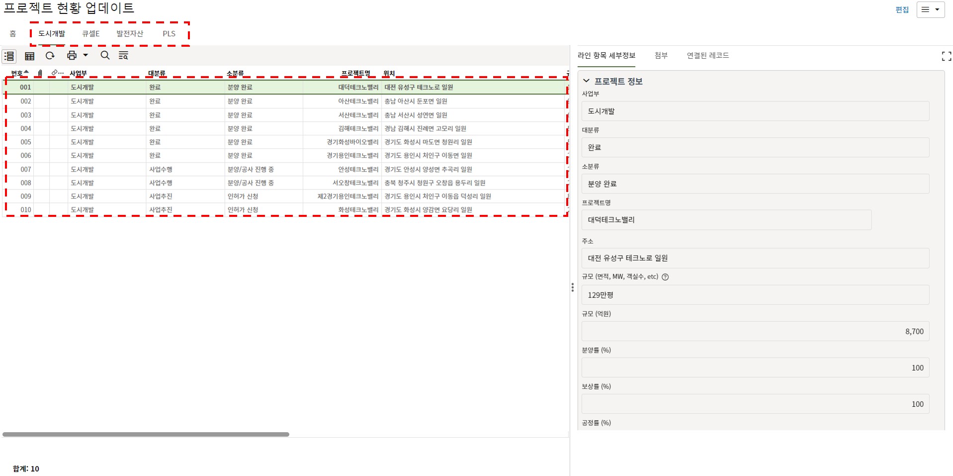 2. 도시개발, 큐셀E, 발전자산(큐셀E), PLS로 탭이 구분되어 있습니다.