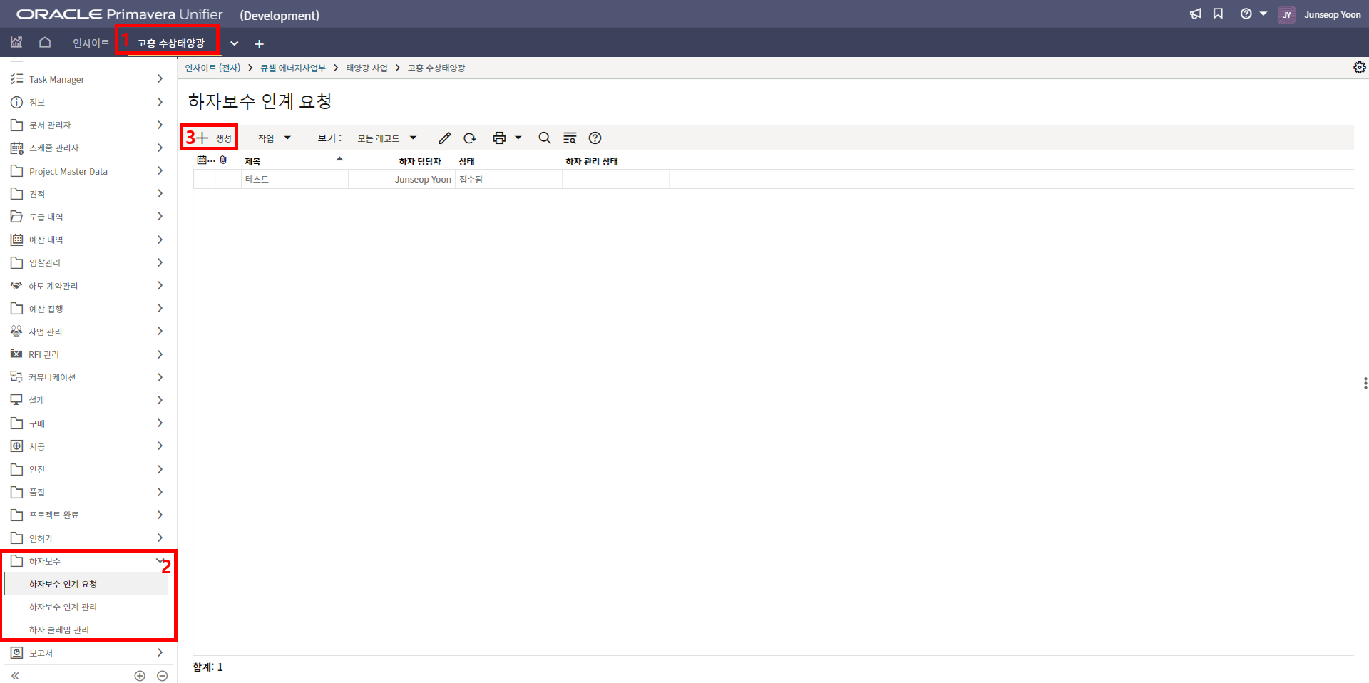 '1)해당 프로젝트 > 2)하자 클레임 관리 > 3)생성'을 클릭합니다.